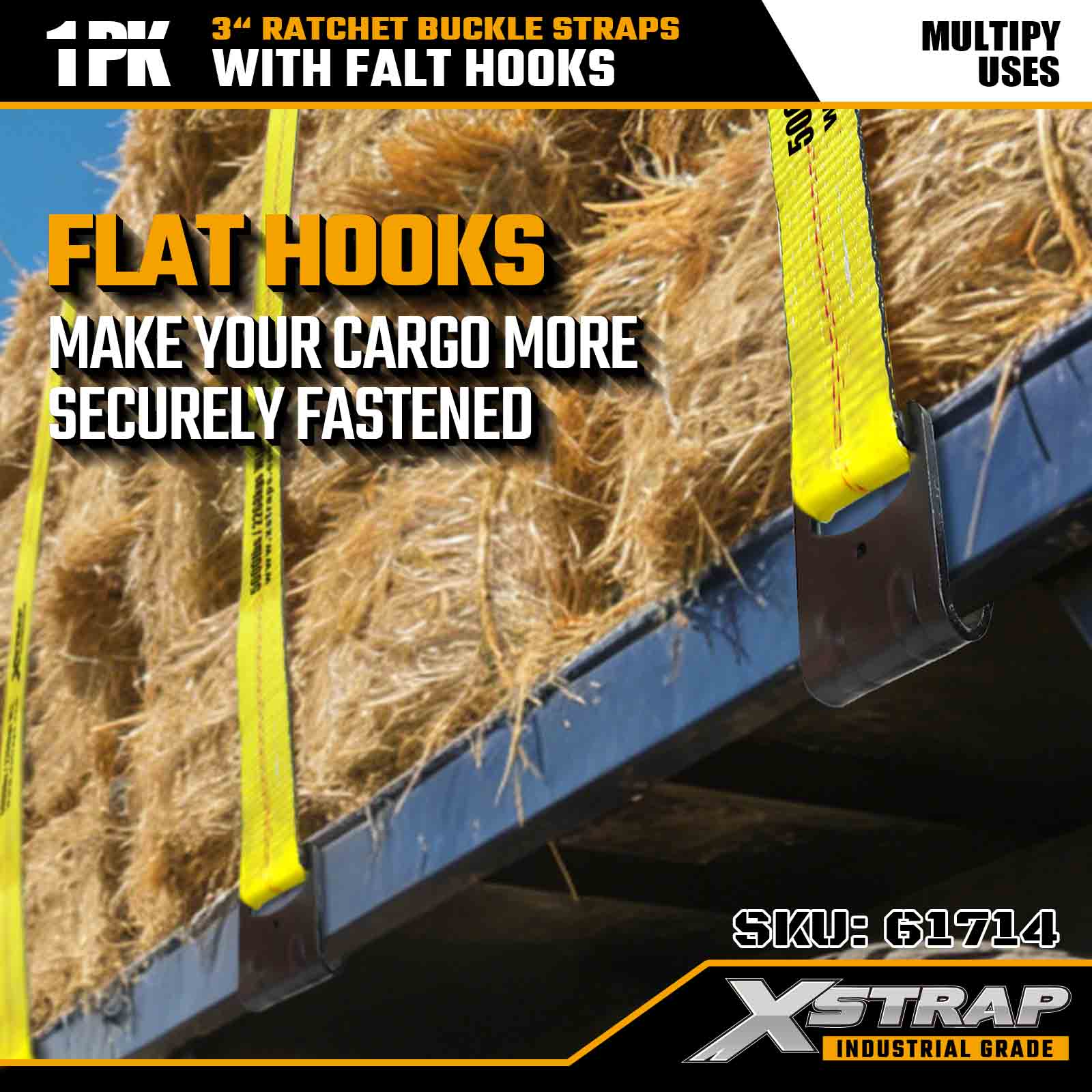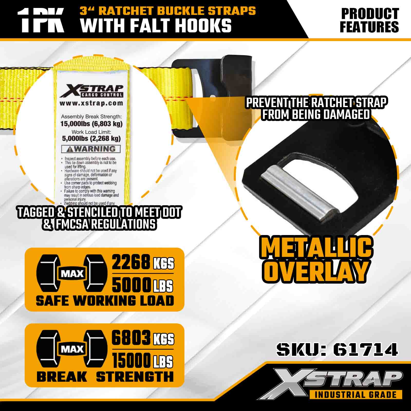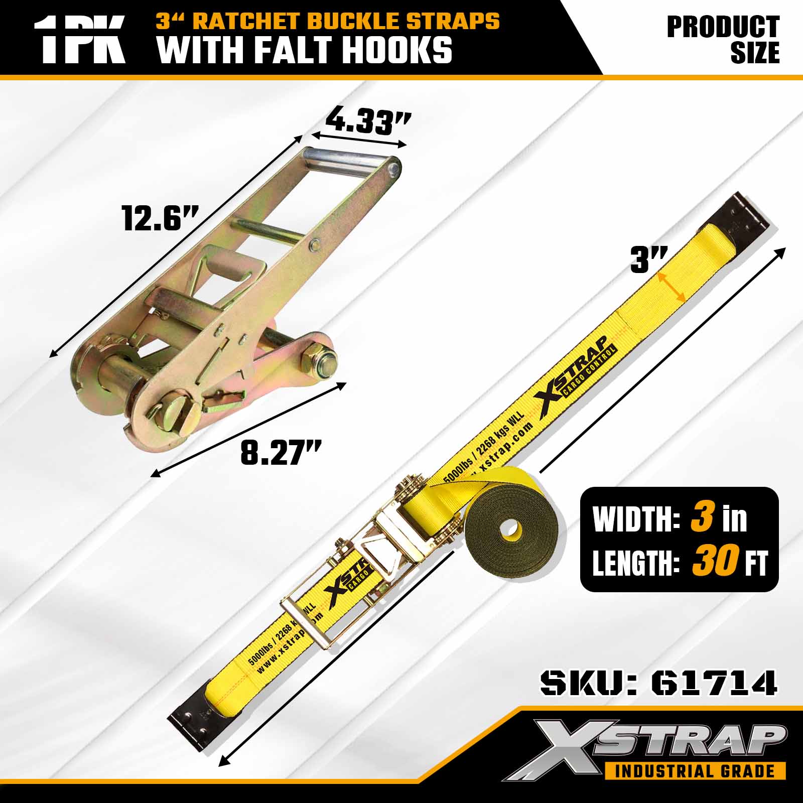 Xstrap 61714 Correas con hebilla de trinquete de 3" x 30 pies (paquete de 1): ganchos planos, capacidad de carga de 5,000 lb, resistencia a la rotura de 15,000 lb, amarre resistente para camiones, remolques y transporte de carga industrial.