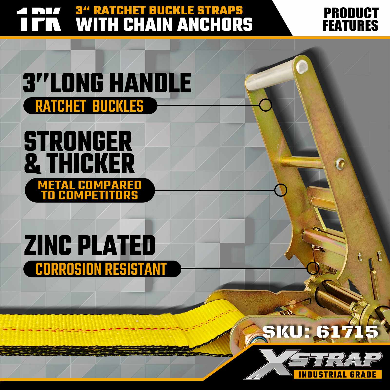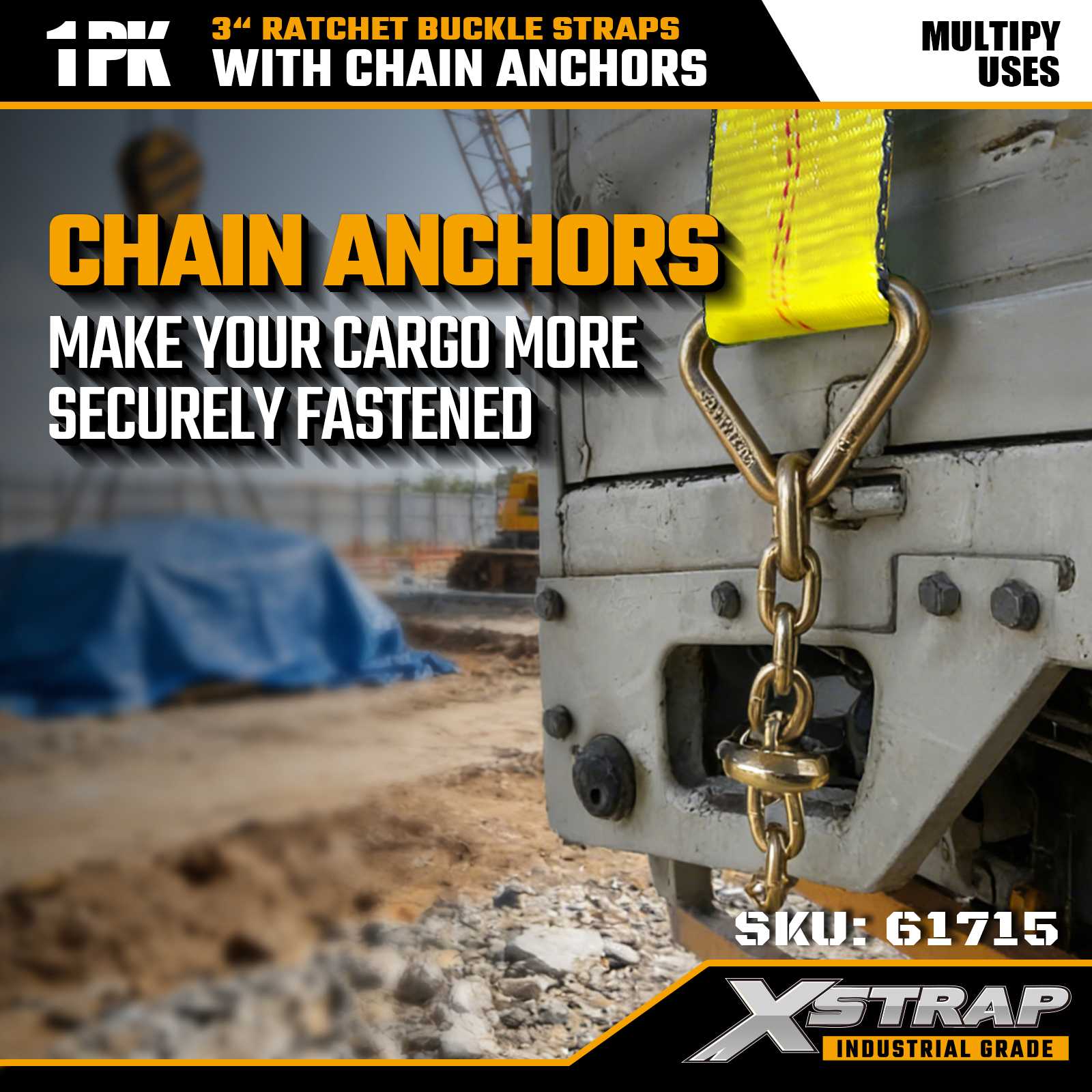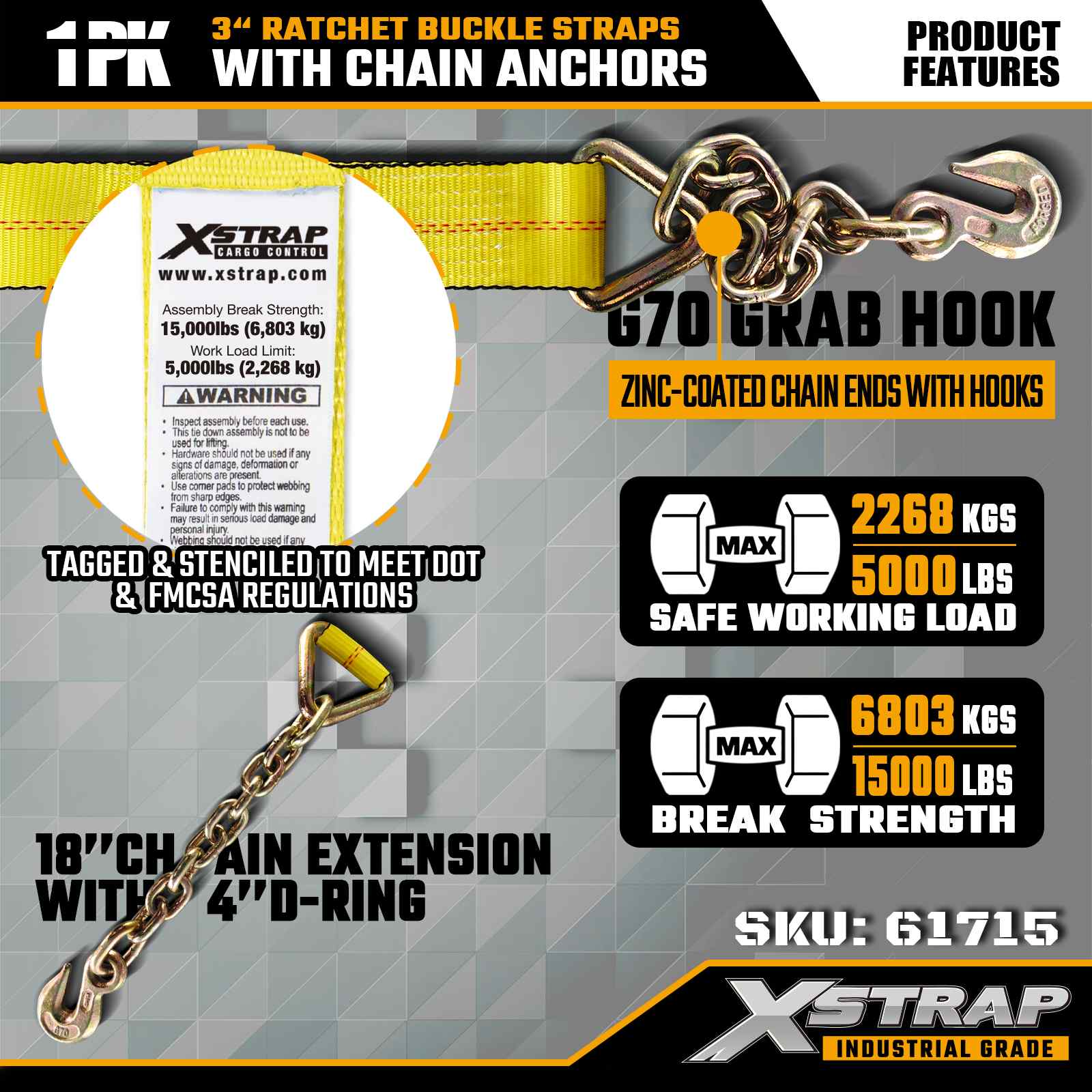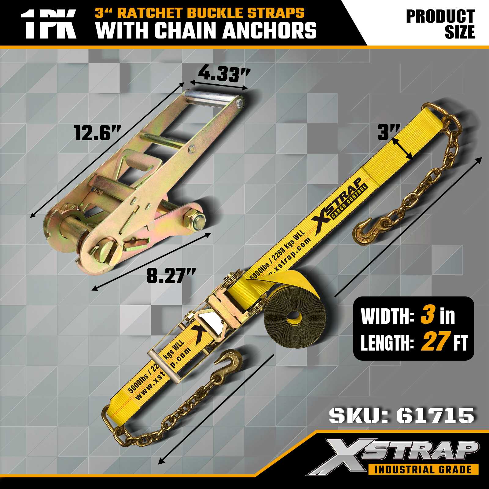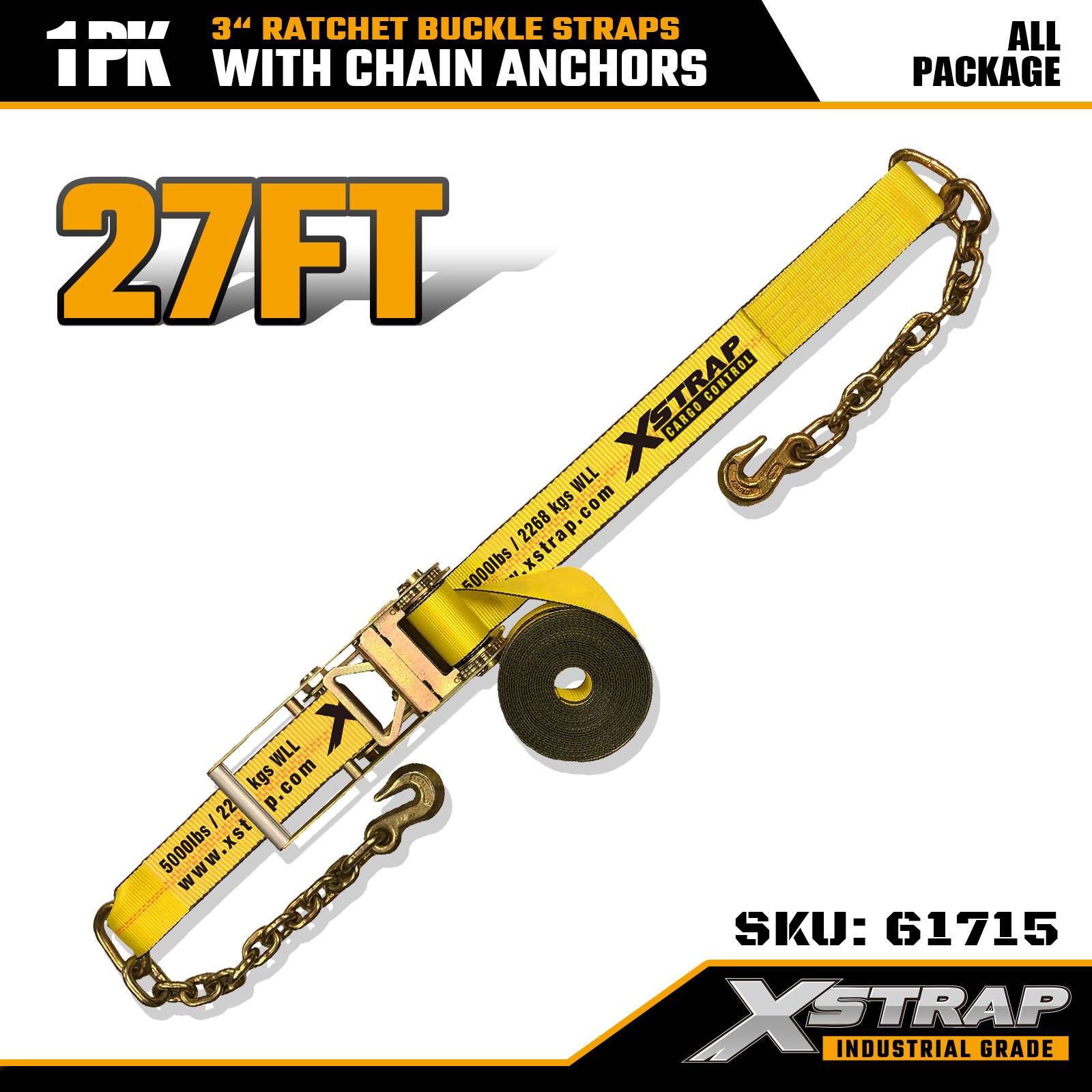 Xstrap 61715 Correas con hebilla de trinquete de 3" x 27 pies (paquete de 1): anclajes de cadena, capacidad de carga de 5,000 lb, resistencia a la rotura de 15,000 lb. Diseñadas para el control de cargas pesadas, estas correas combinan correas de grado industrial con extremos de anclaje de cadena para máxima seguridad en camiones, remolques y transporte de construcción.