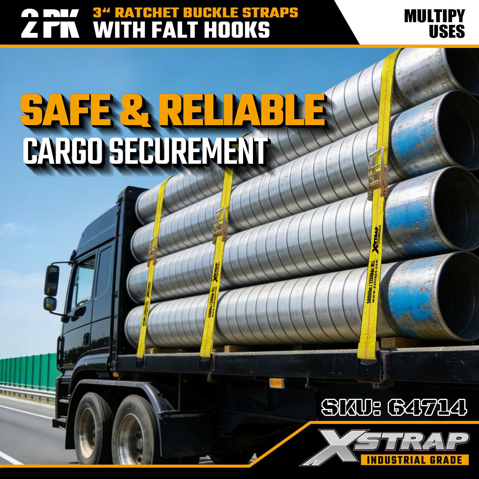 Xstrap 64714 Correas con hebilla de trinquete de 3" x 30 pies (paquete de 2): ganchos planos, capacidad de carga de 5,000 lb, resistencia a la rotura de 15,000 lb. Diseñadas para el control de carga profesional, estas correas de alta resistencia brindan alcance extendido y conveniencia de paquete doble para camiones, remolques y transporte industrial.