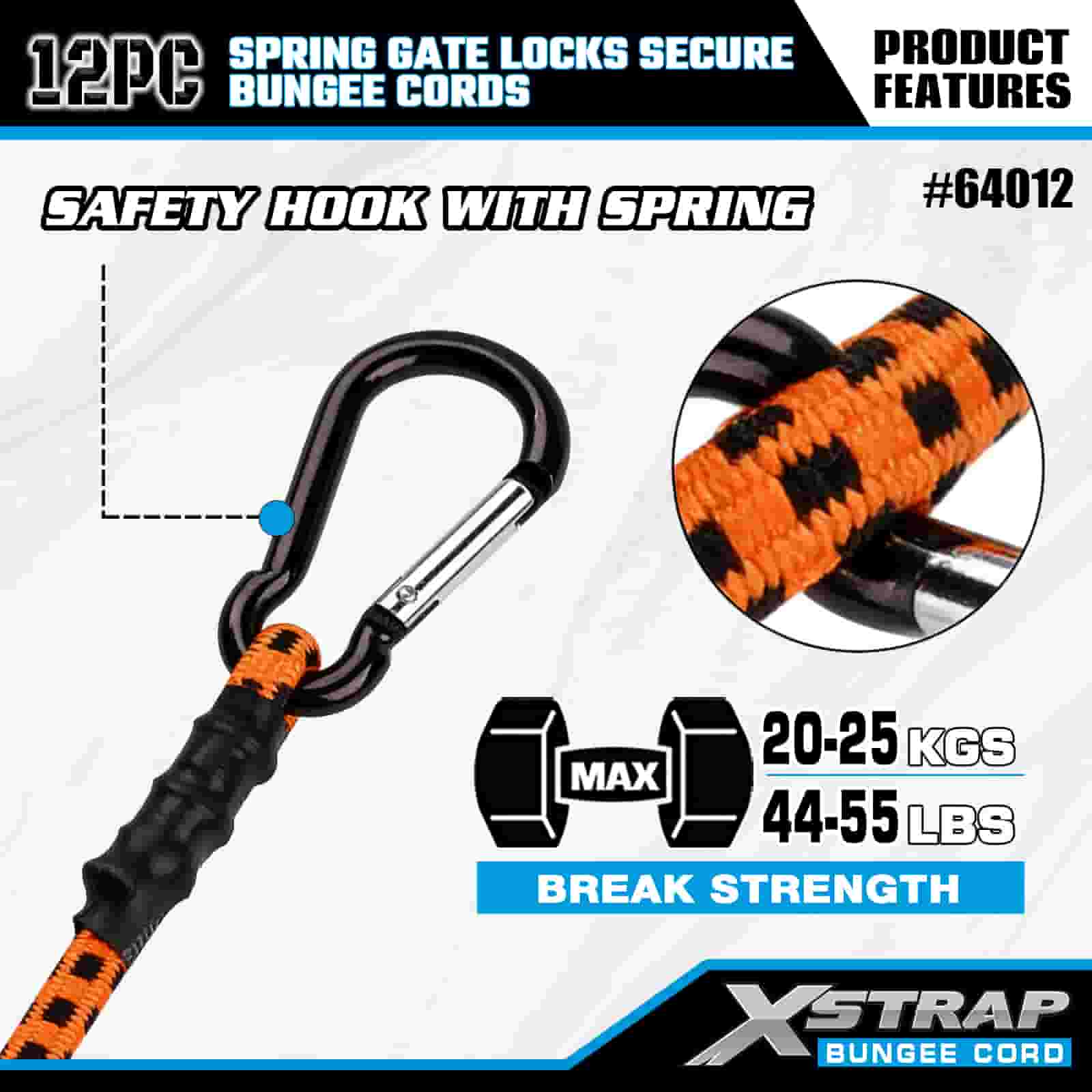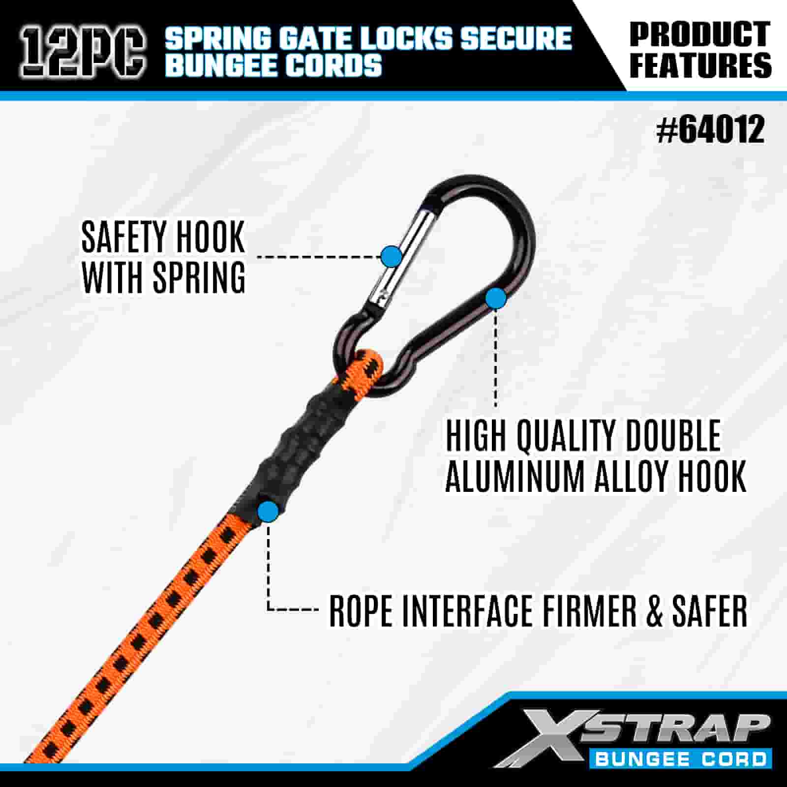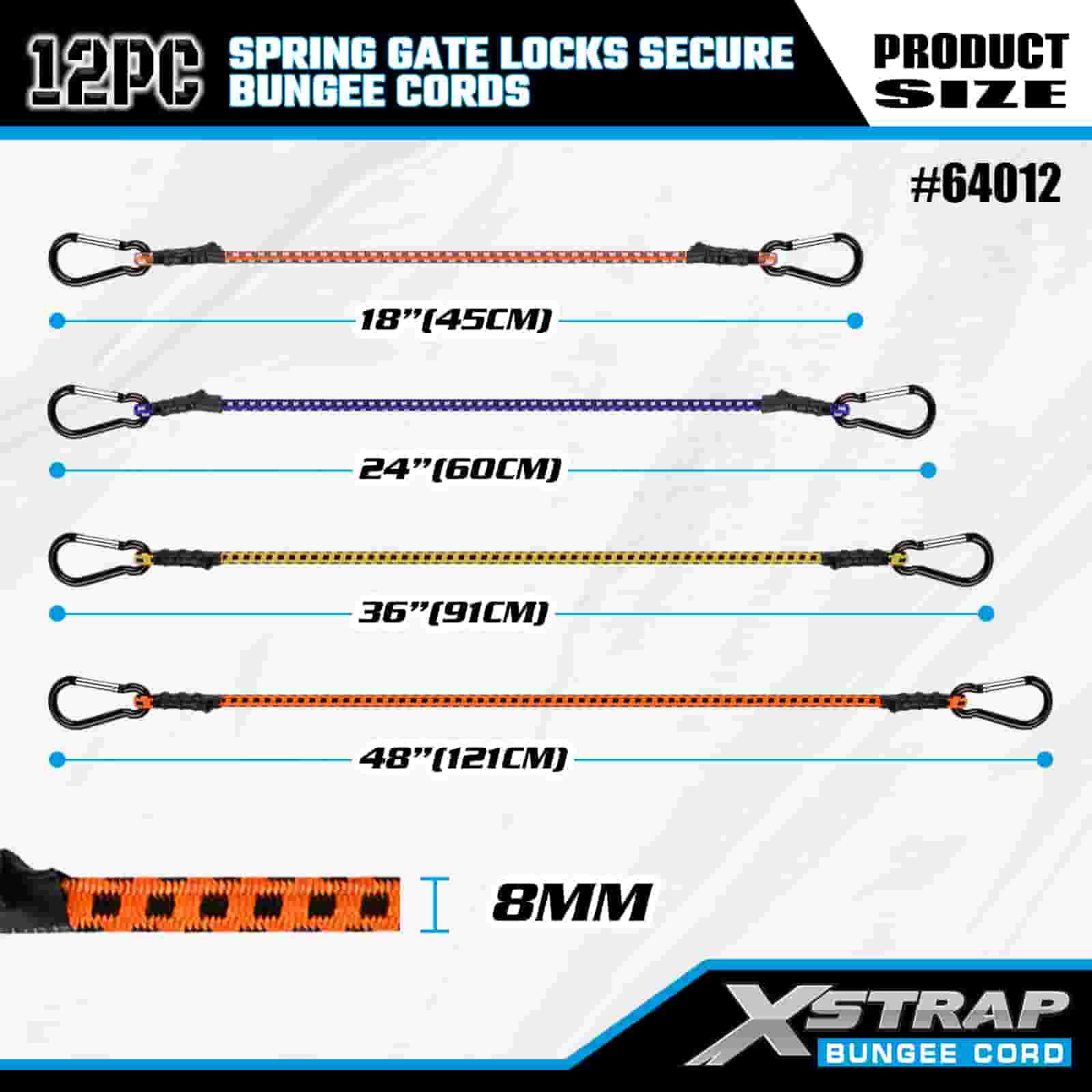 Paquete de 12 cerraduras de puerta con resorte Xstrap, cuerdas elásticas seguras de 8 mm x 18”/24” /36”/ 48”, resistencia a la rotura de 88 a 110 libras con ganchos mosquetones con cerradura de puerta con resorte segura.