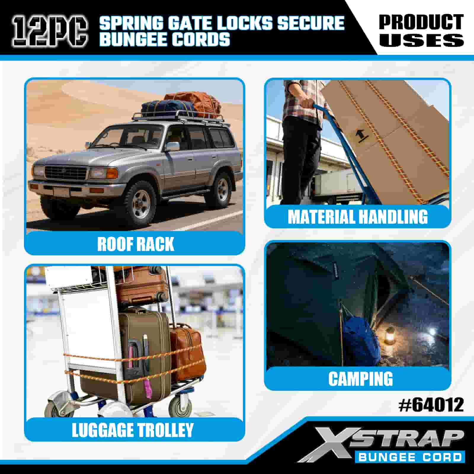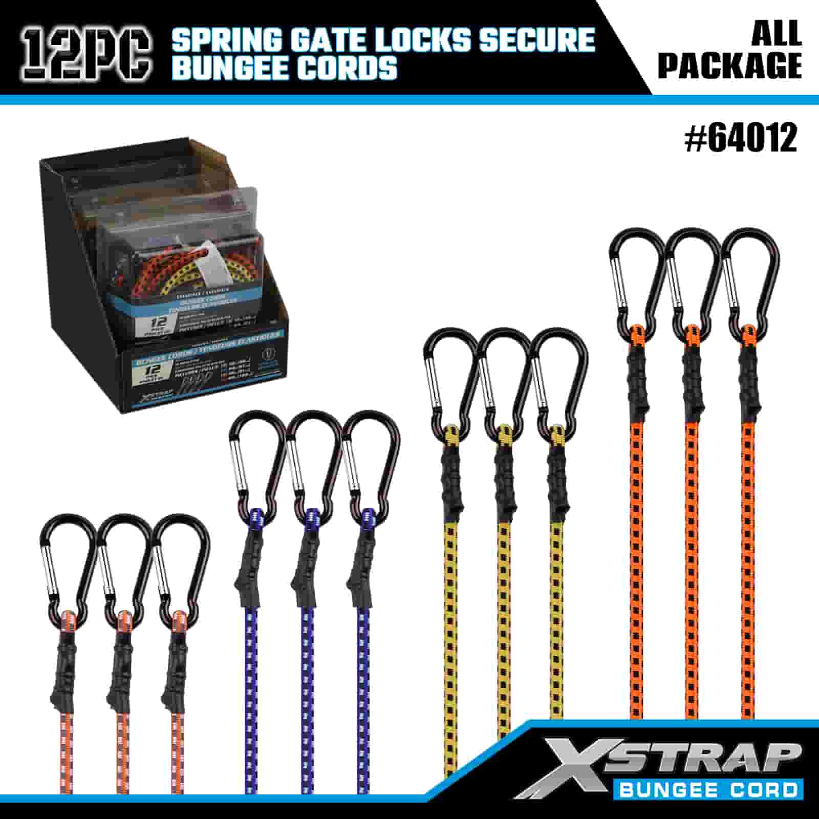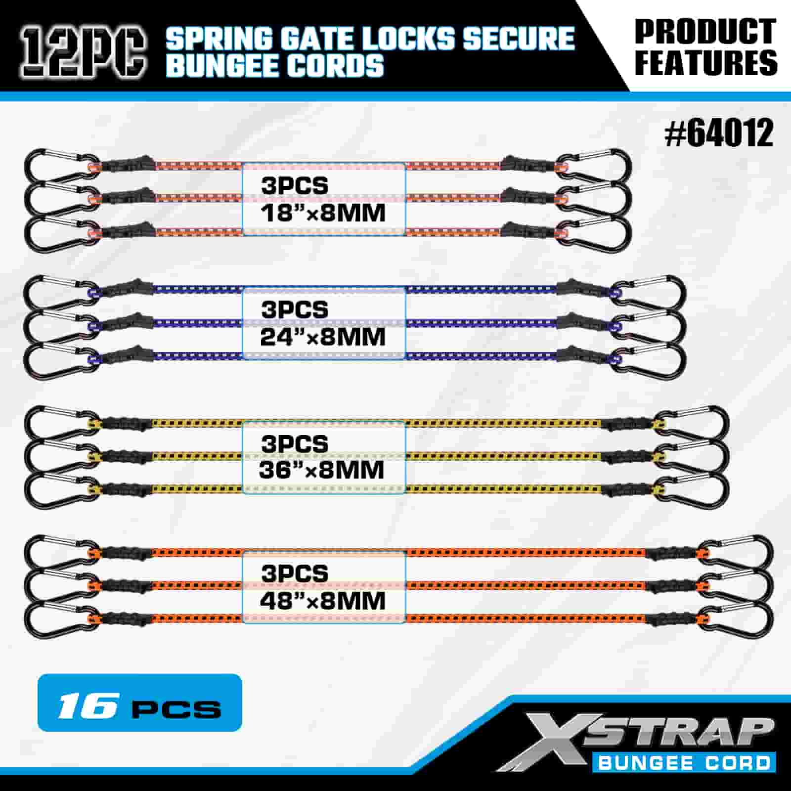 Paquete de 12 cerraduras de puerta con resorte Xstrap, cuerdas elásticas seguras de 8 mm x 18”/24” /36”/ 48”, resistencia a la rotura de 88 a 110 libras con ganchos mosquetones con cerradura de puerta con resorte segura.