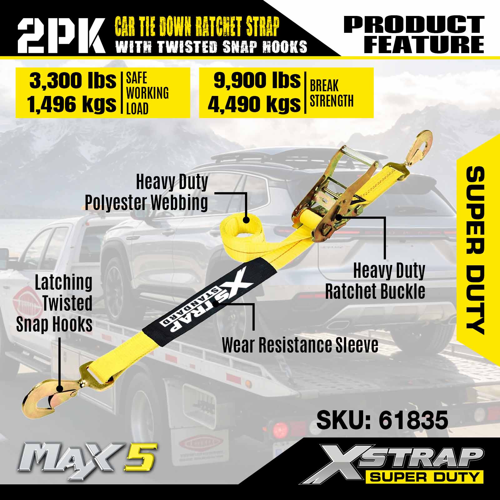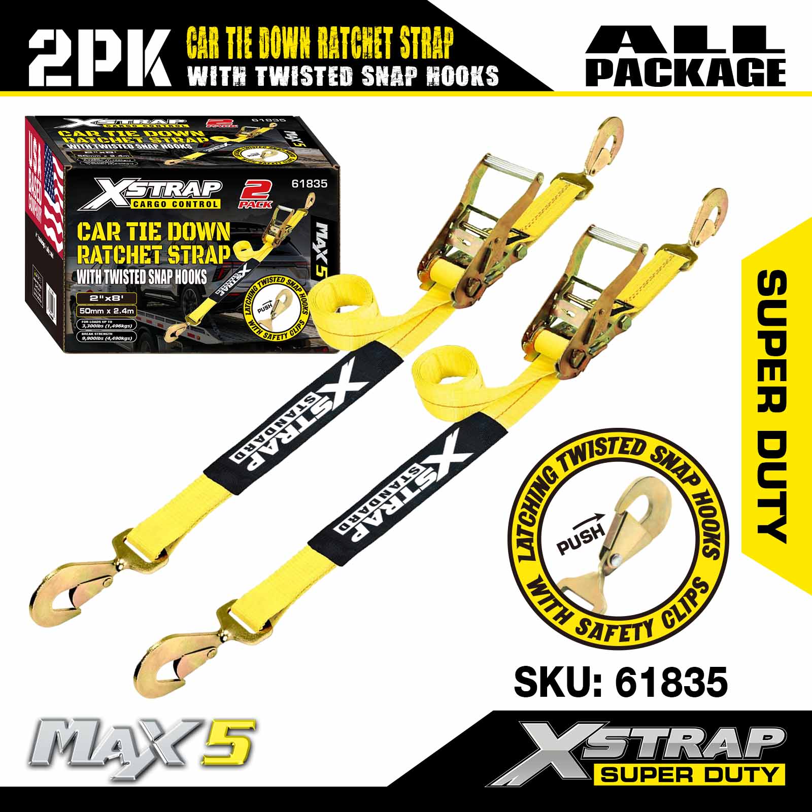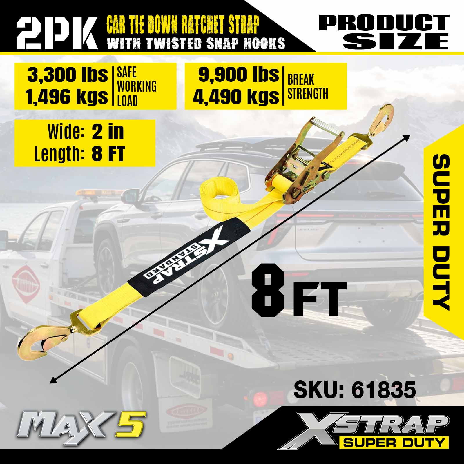 Xstrap Correas de amarre para remolques, correas de trinquete para transporte de automóviles de alta resistencia de 2 x 8 pulgadas, 2 unidades, resistencia a la rotura de 10,000 libras