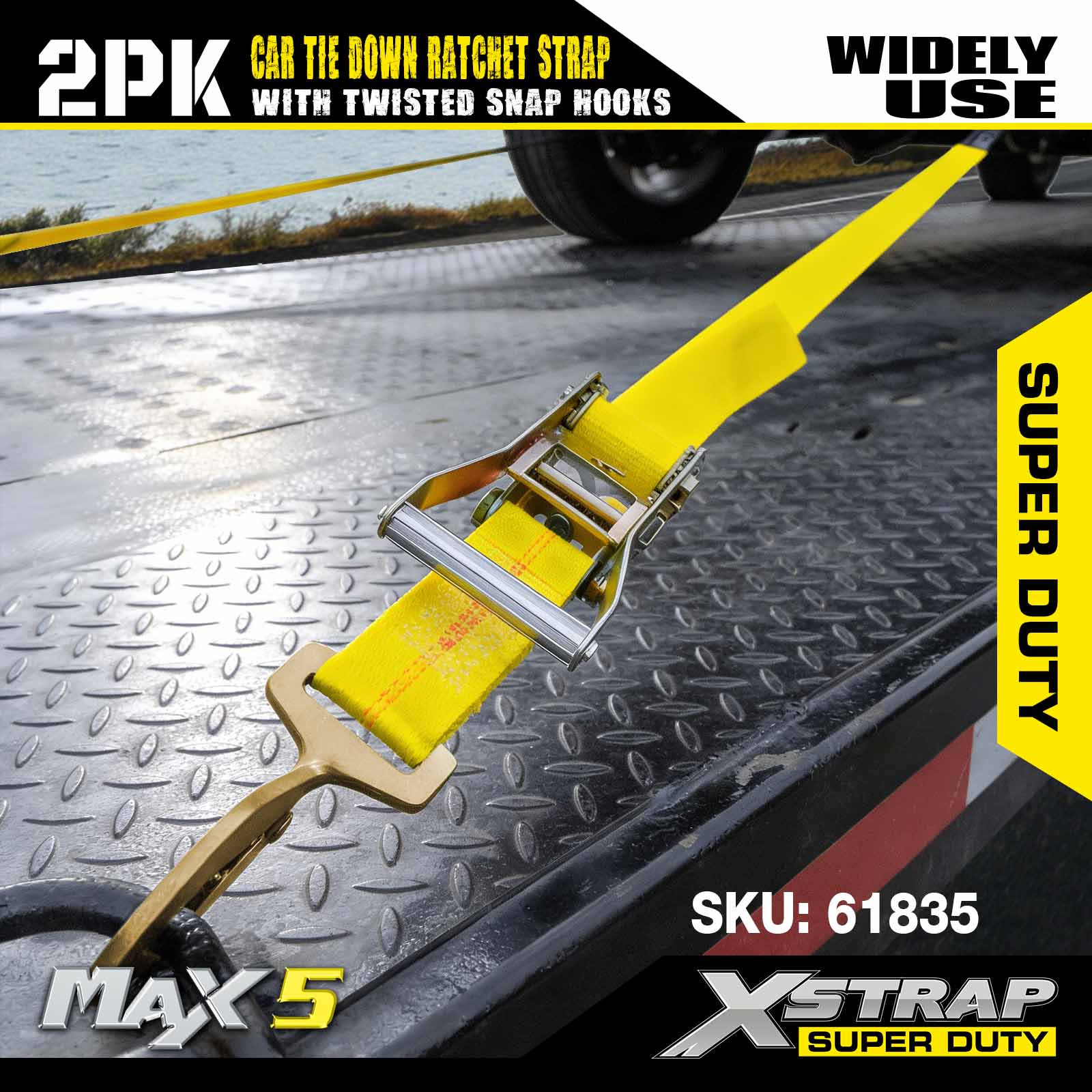 - Diseño versátil de paquete de 2: el juego de 2 piezas se puede utilizar para asegurar cargas más pequeñas (por ejemplo, un solo eje de un vehículo) o complementar un juego completo de amarres para mayor estabilidad. Cada correa es liviana y fácil de plegar, con un empaque compacto que cabe en los compartimientos de almacenamiento del remolque o en las cajas de herramientas.