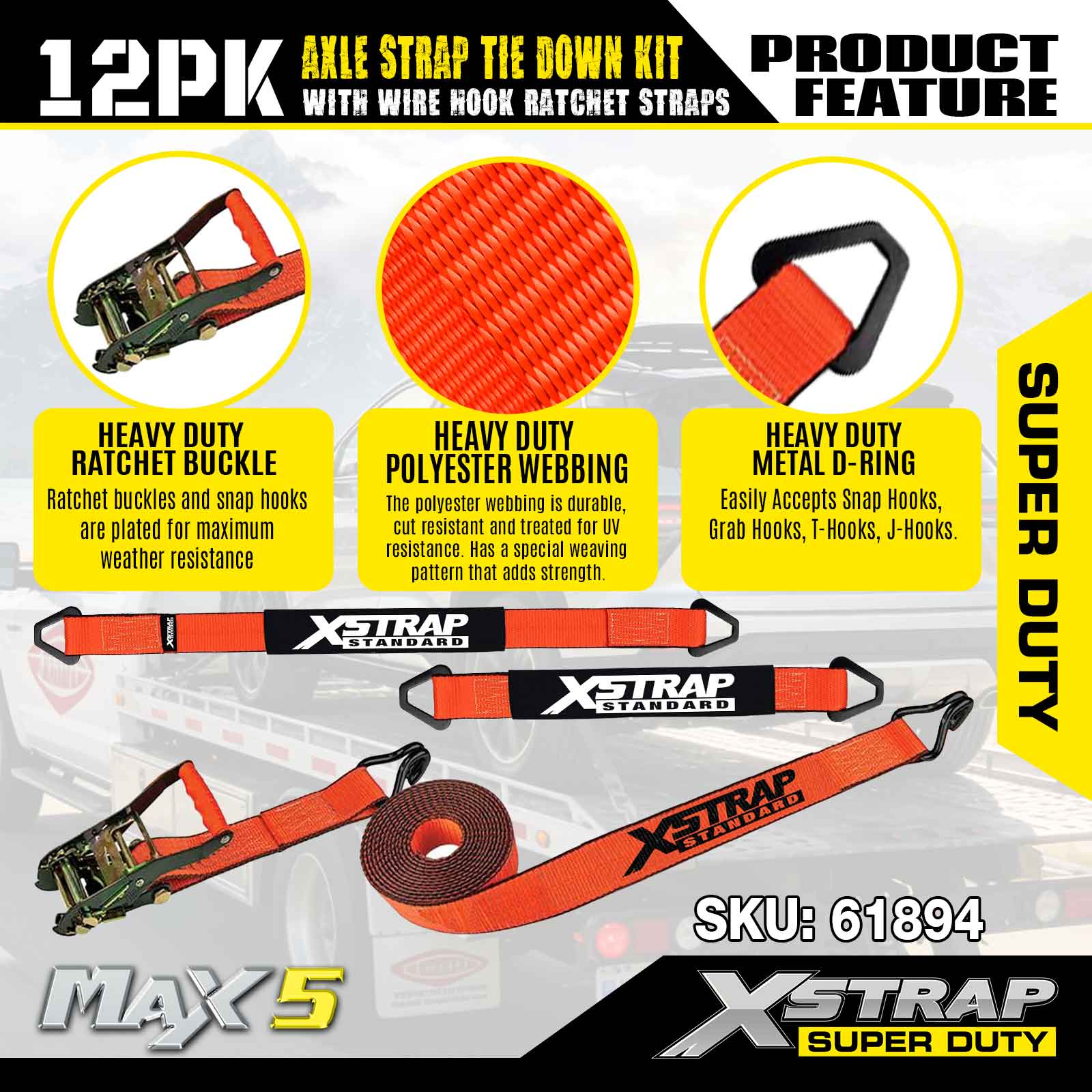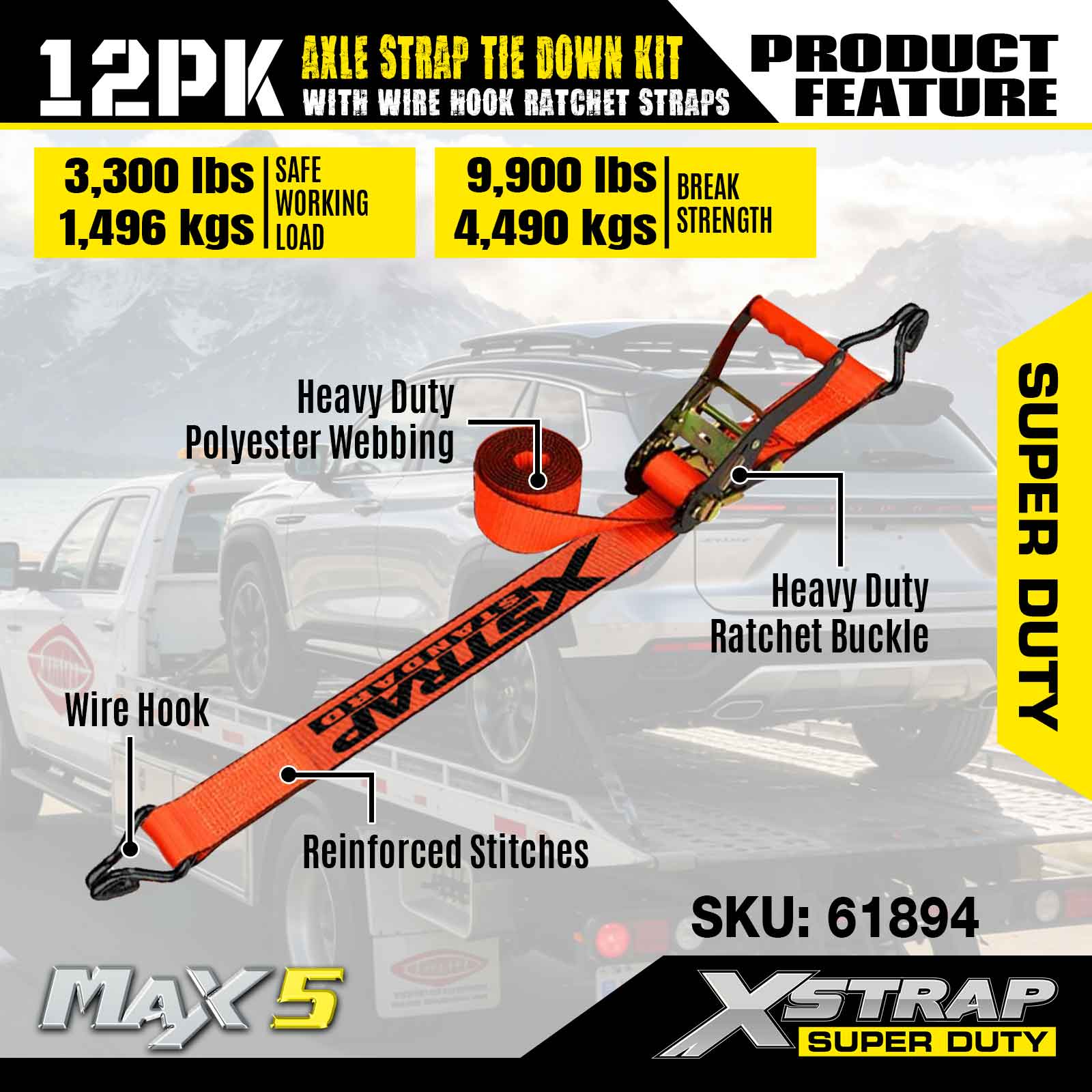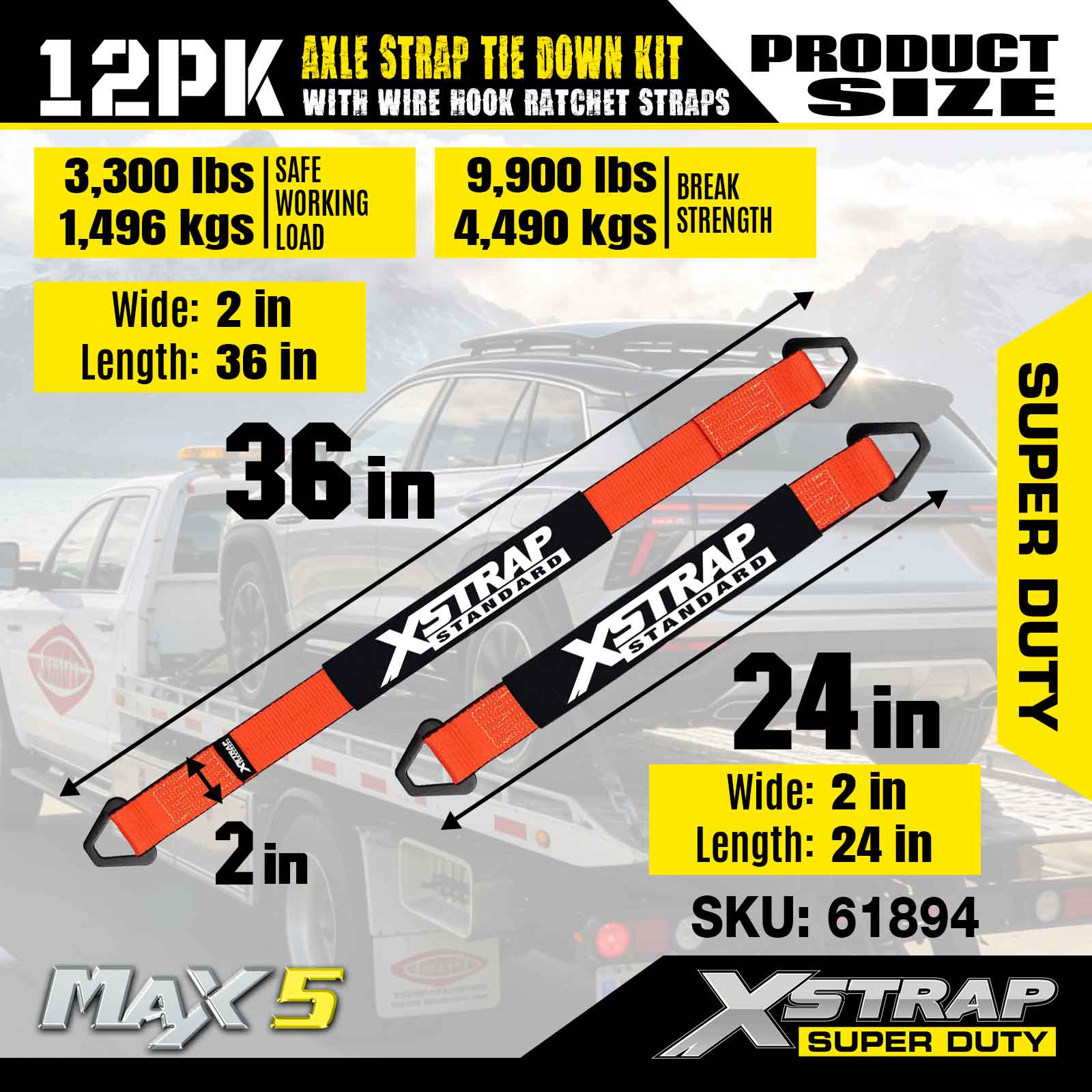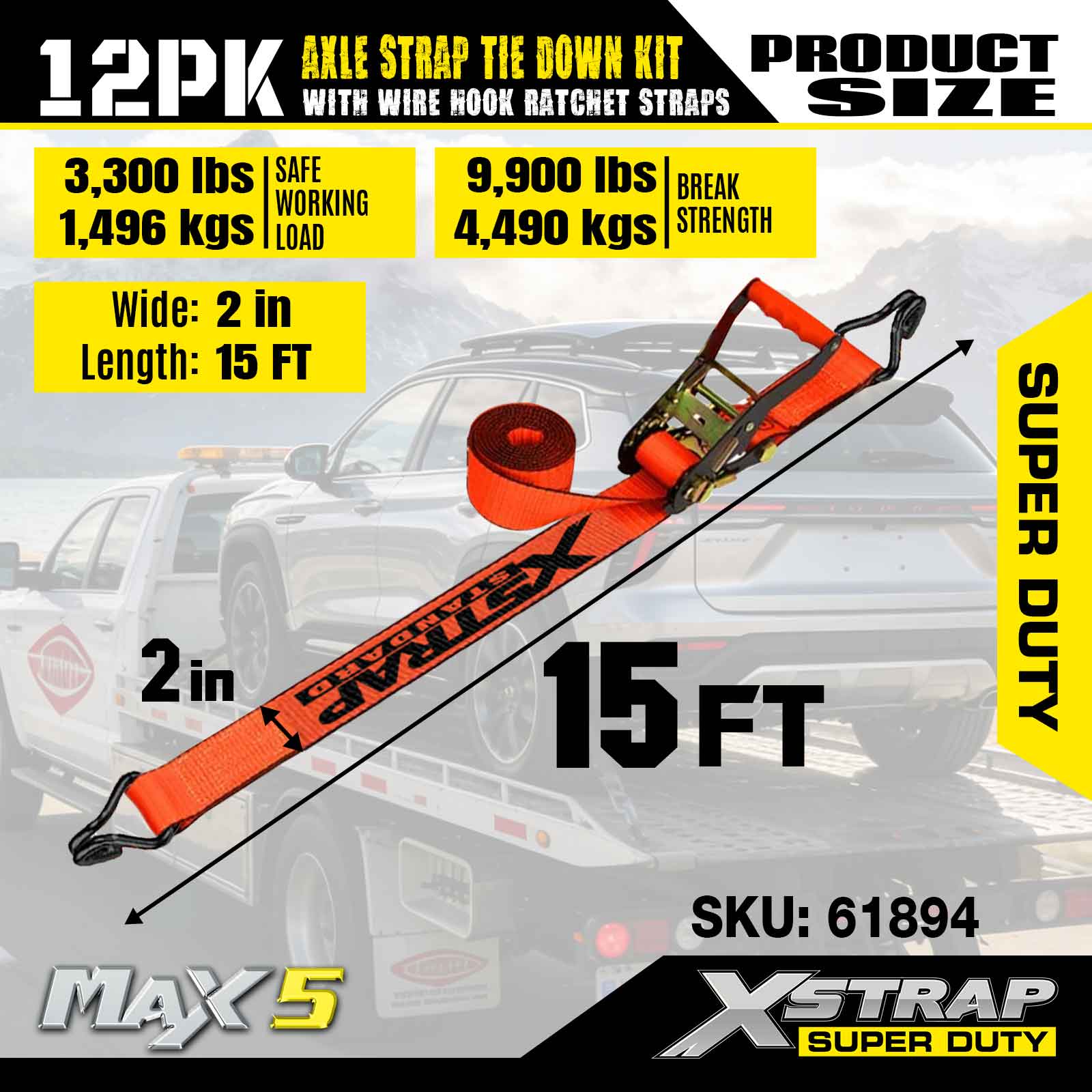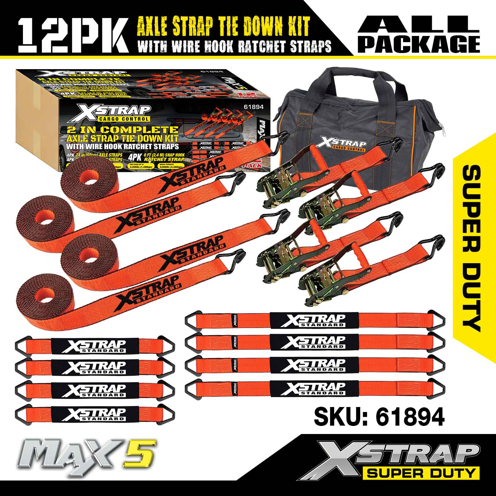 Kit de amarre de correas para ejes Xstrap 12PK (con correas de trinquete con gancho de alambre) - Super Duty. Tiene una carga de trabajo segura de 3300 libras (1496 kg) y una resistencia a la rotura de 9900 libras (4490 kg).