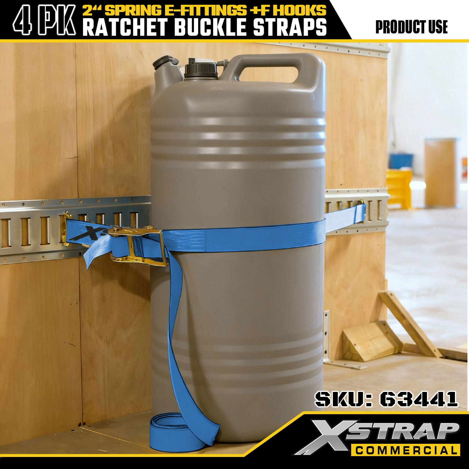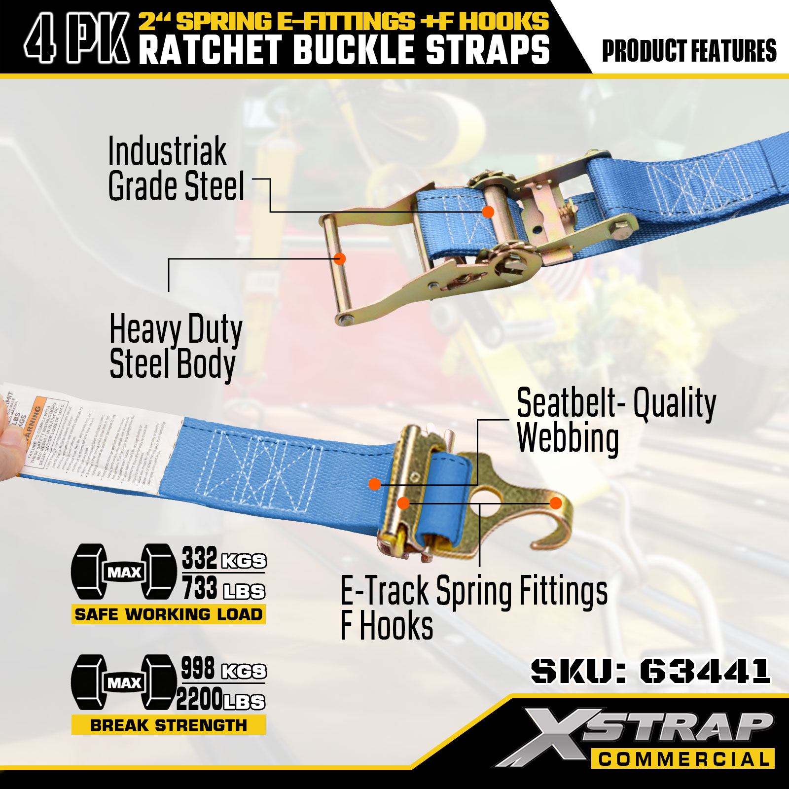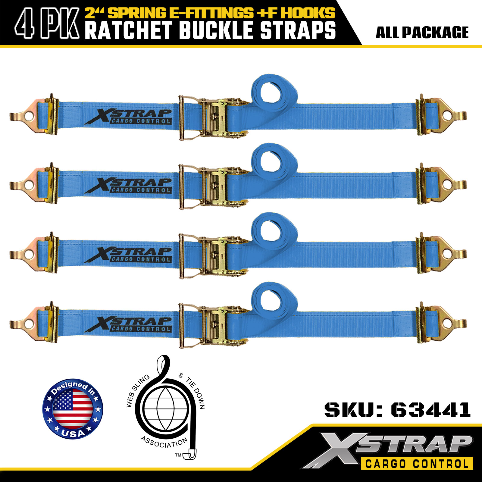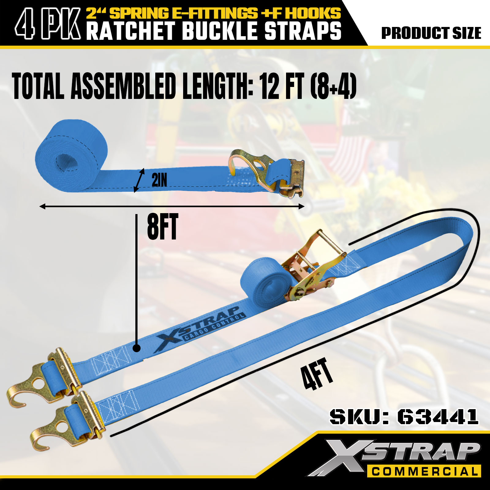 Xstrap Paquete de 4 correas de amarre con trinquete de poliéster de 2" x 12' con accesorios en forma de E y ganchos en F, 733 lbs SWL y 332 lbs de resistencia a la rotura para camiones, mudanzas y transporte de carga general