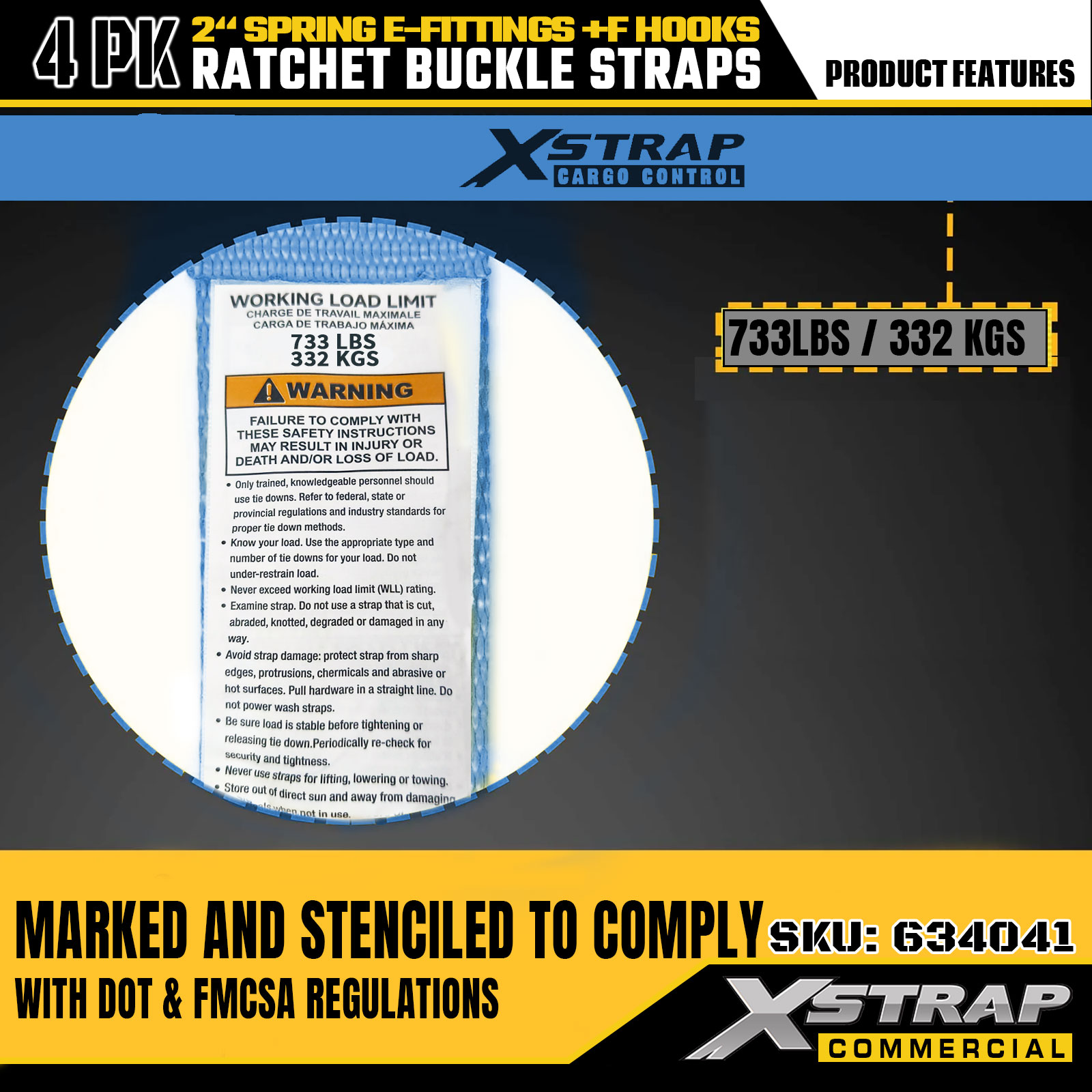 - Indicadores de seguridad legibles: Cada correa está claramente etiquetada con la carga de trabajo segura (SWL) de 733 libras y la capacidad de carga máxima de 332 libras, lo que ofrece instrucciones de seguridad esenciales para una aplicación correcta y segura.