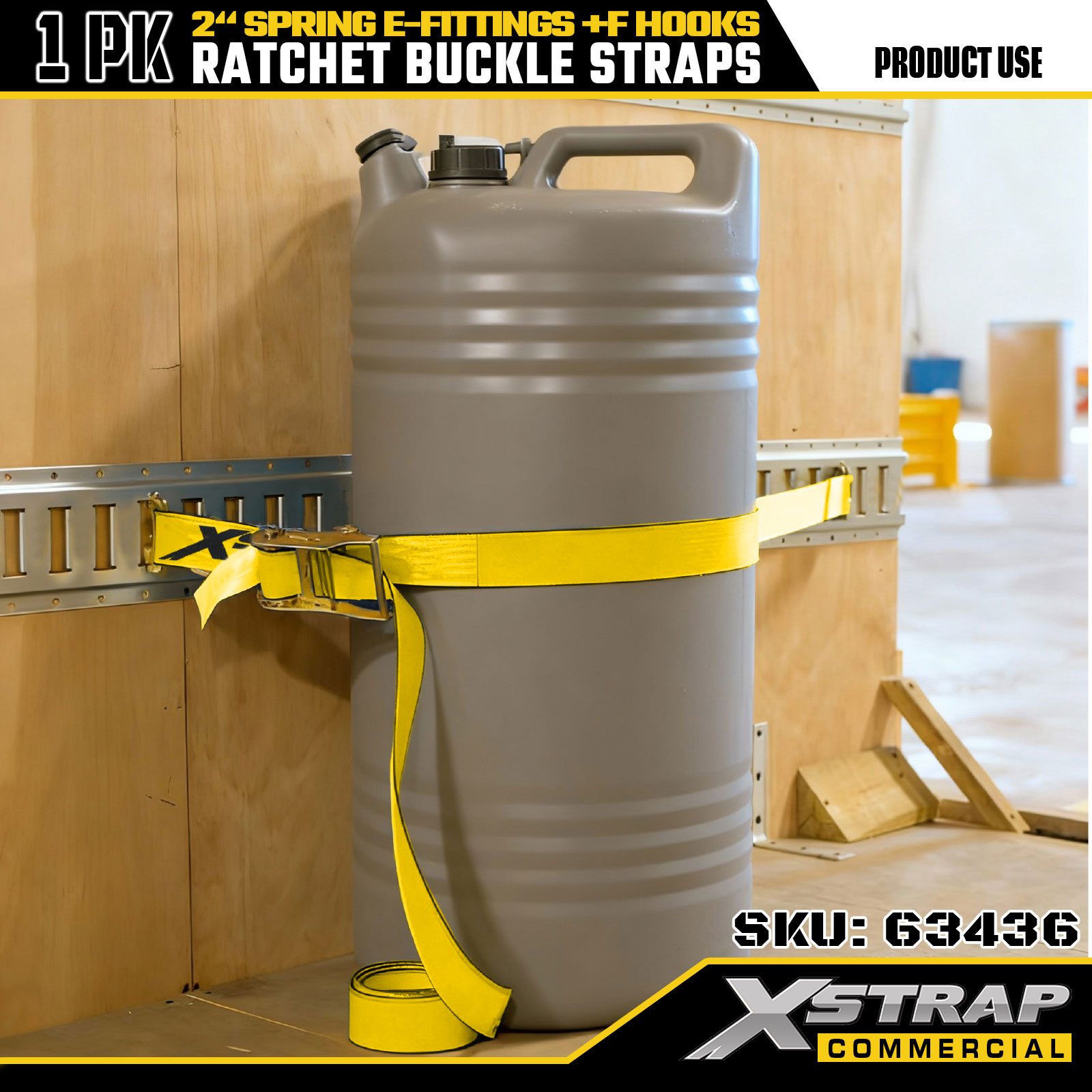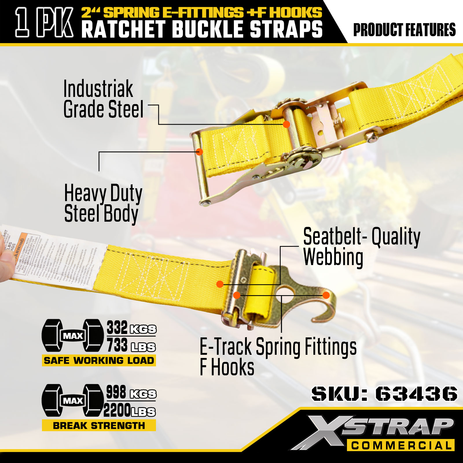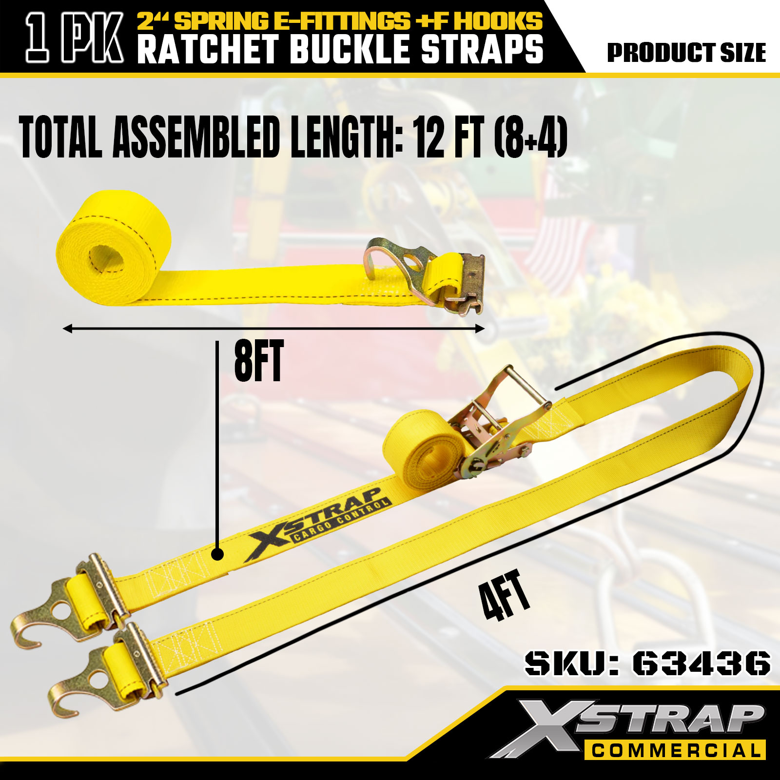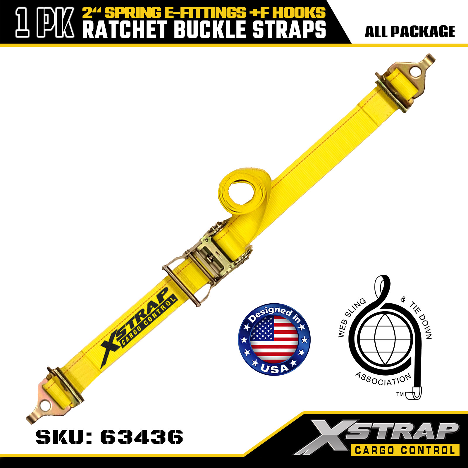 Xstrap 1 paquete de correas de trinquete de amarre, amarres de carga resistentes de 2" x 12' con accesorios en forma de E de resorte y ganchos F (amarillo), capacidad de 733 libras para seguridad de remolques, camiones, furgonetas y motocicletas