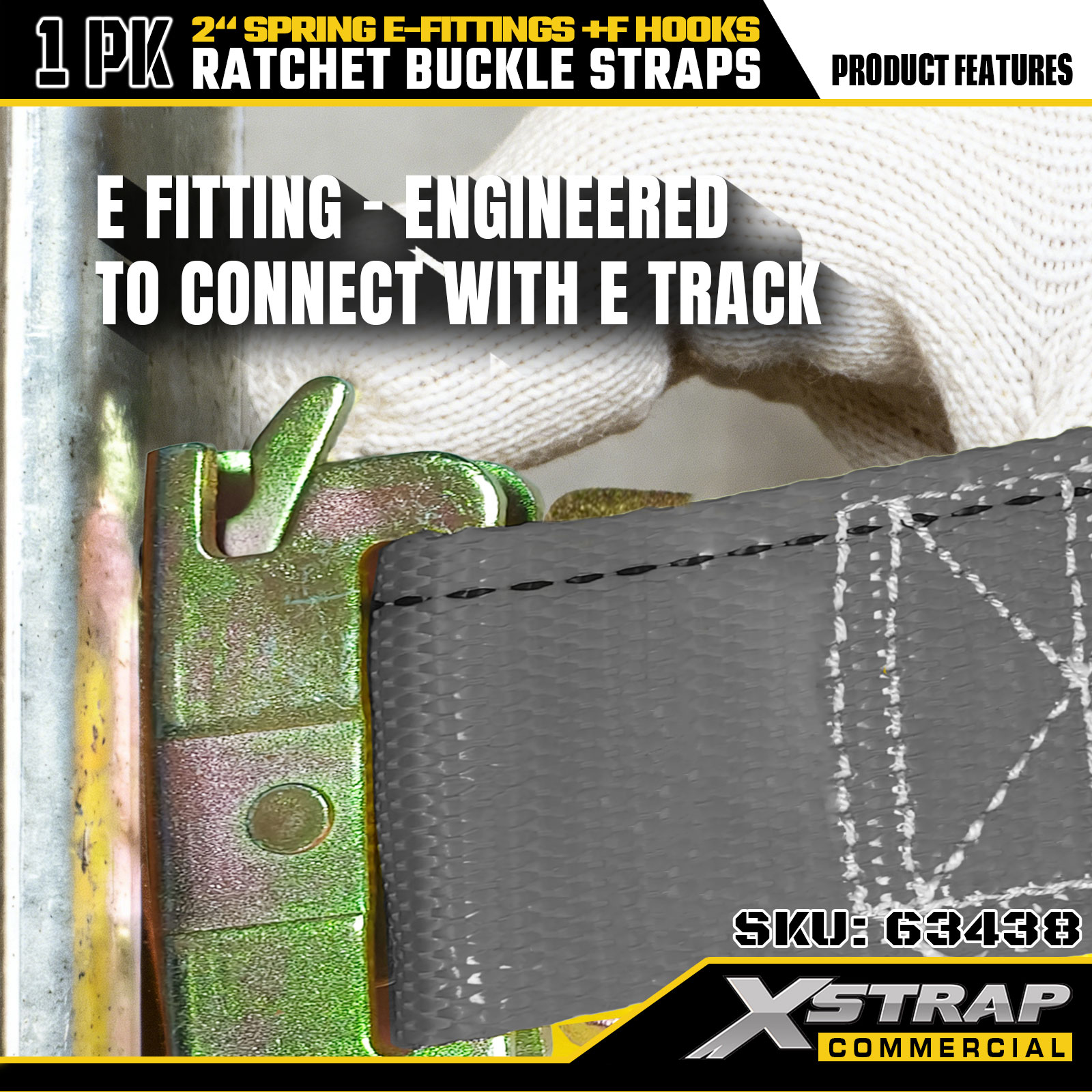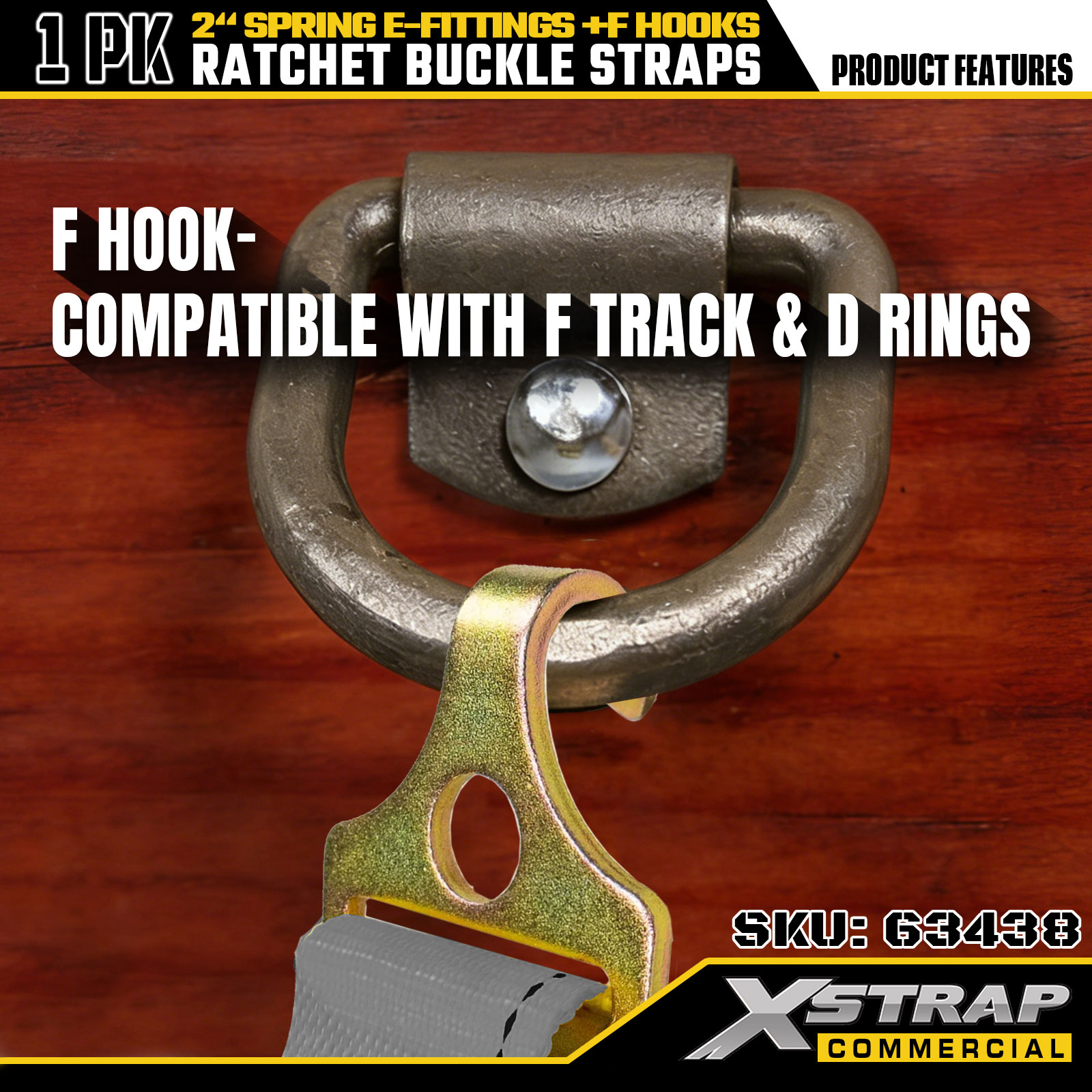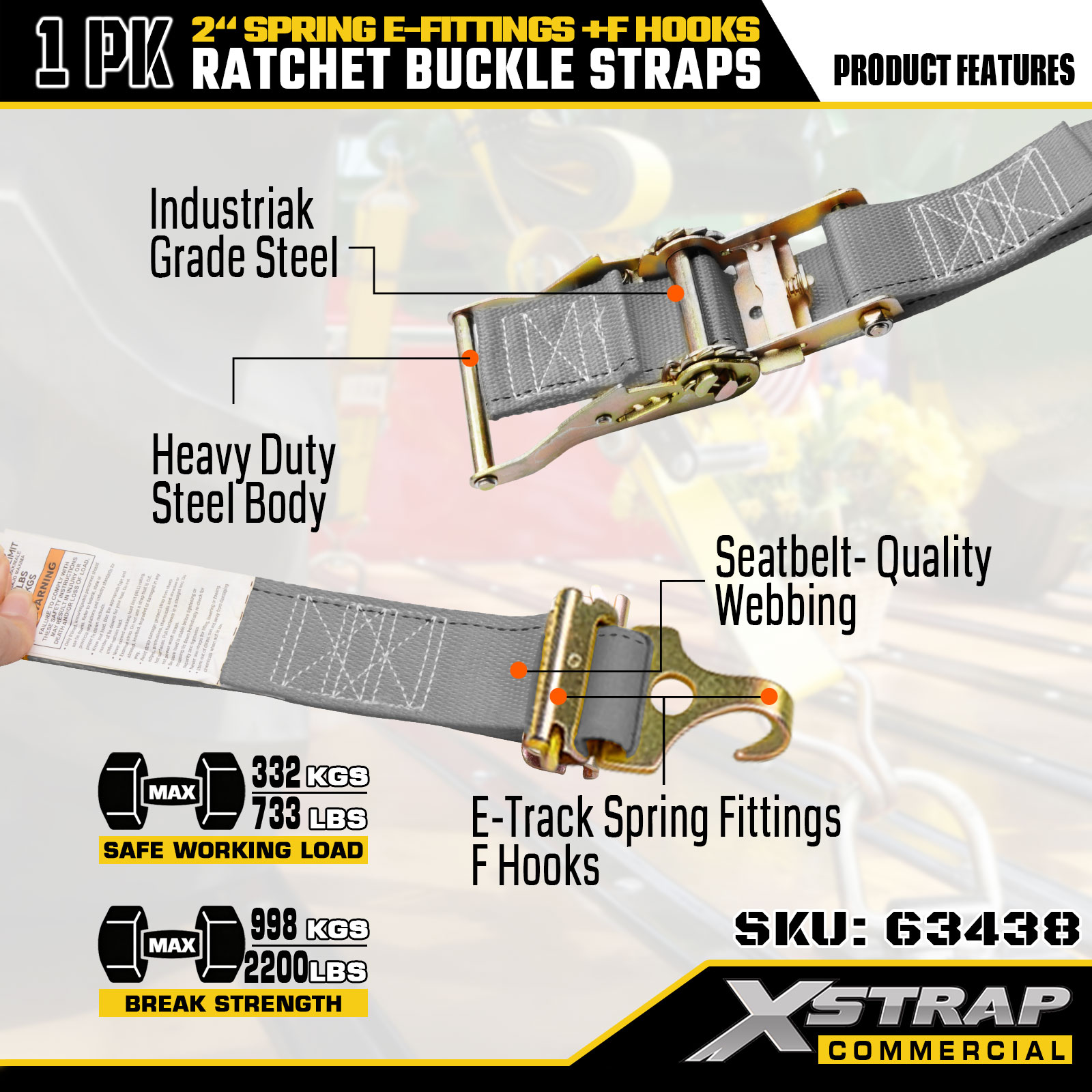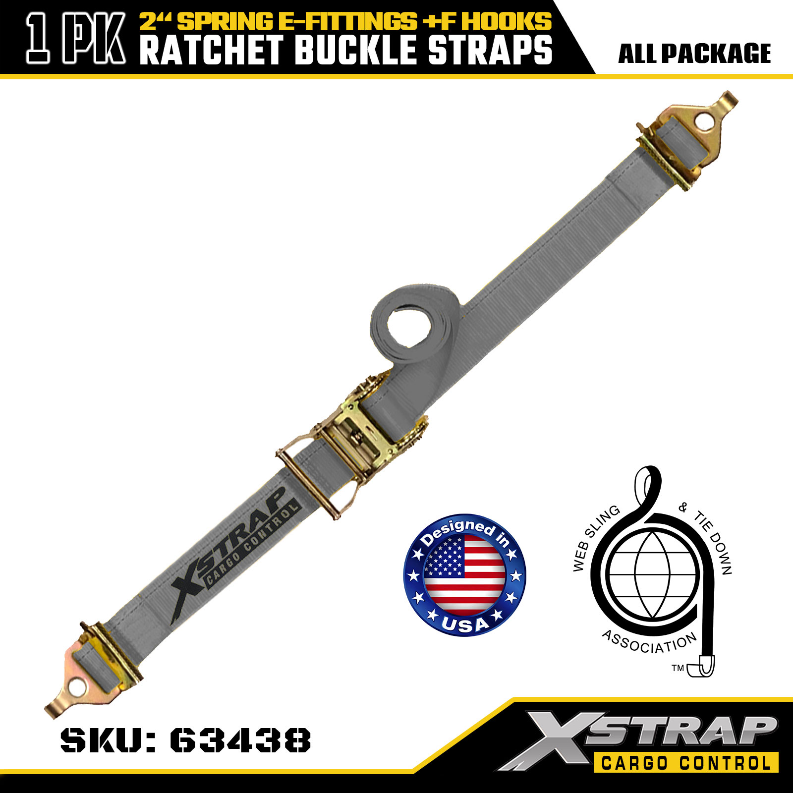 Xstrap 1 paquete de correas de amarre con trinquete de poliéster de 2" x 16' con accesorios en E de resorte y ganchos F, 733 lbs SWL y 332 lbs de resistencia a la rotura para camiones, mudanzas, transporte de carga general