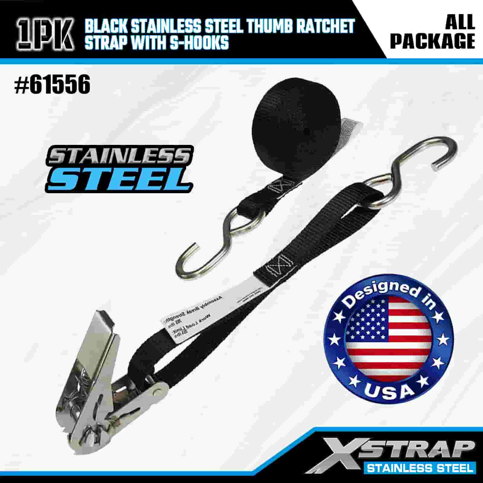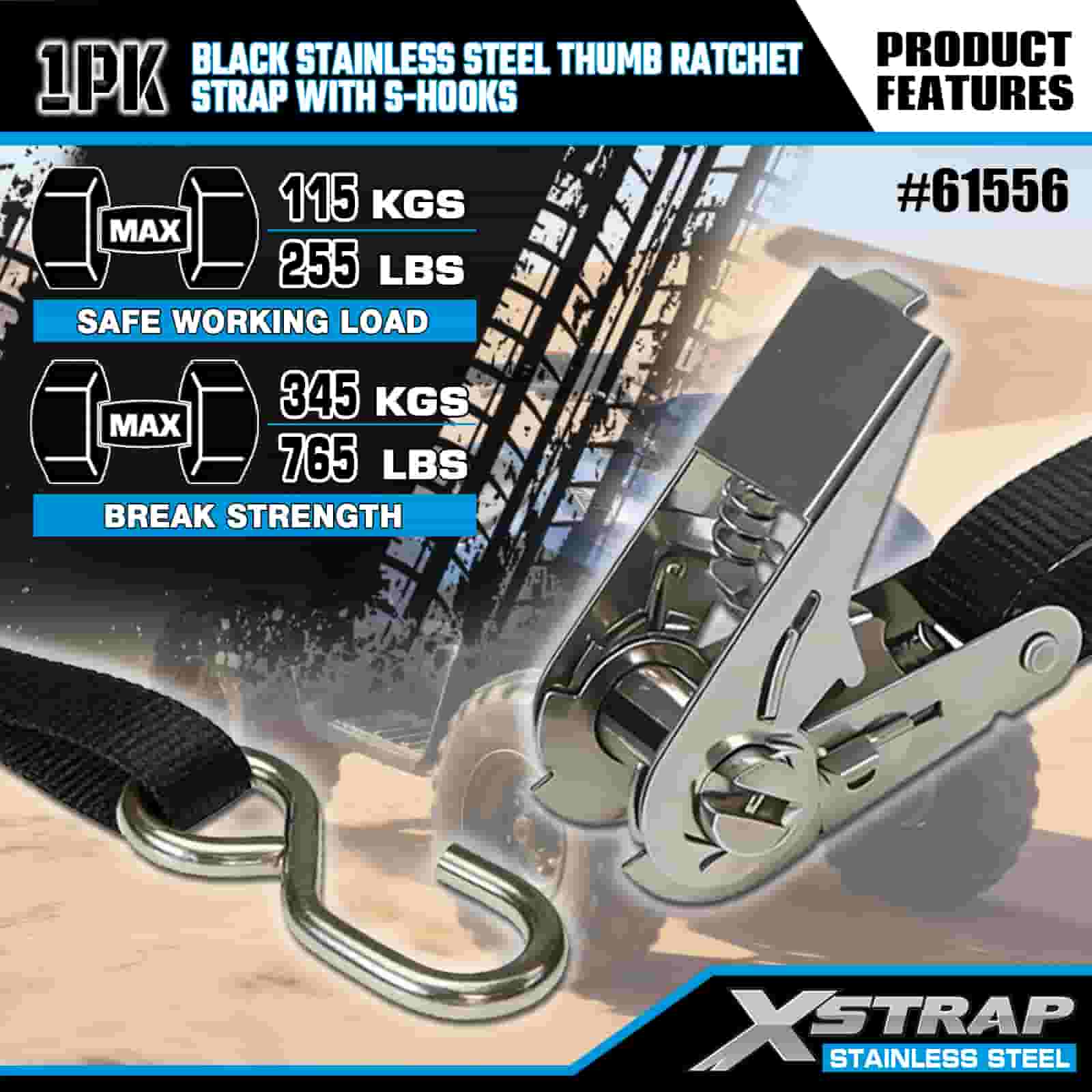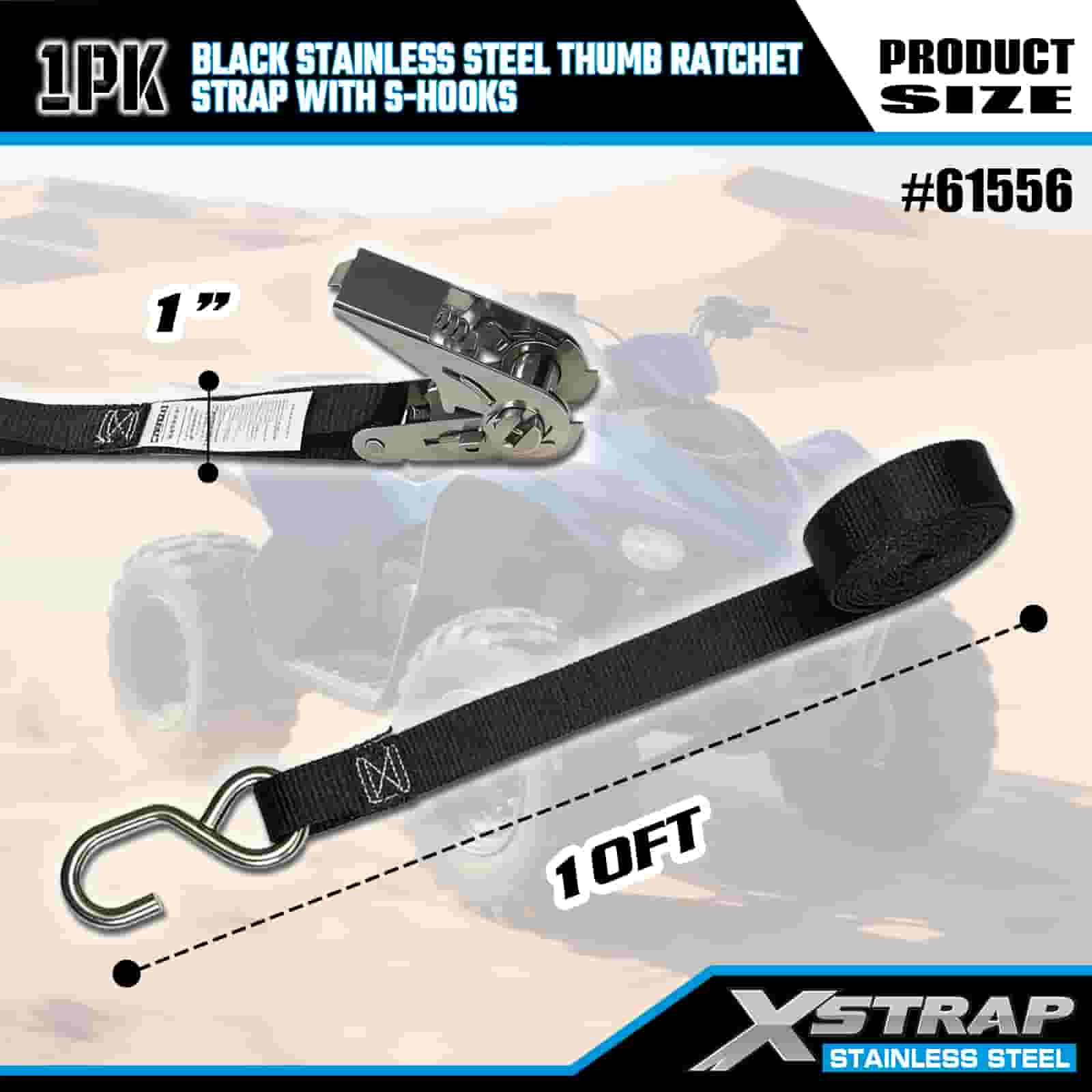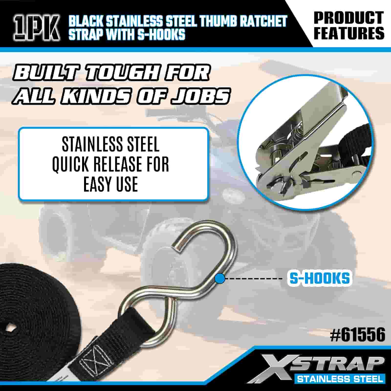 Xstrap Trinquete de pulgar de acero inoxidable negro con ganchos en S, correa de amarre de poliéster de 1" x 10', correa de trinquete con capacidad de 255 libras, correas de seguridad de amarre de carga con ganchos en S para remolque, remolque de plataforma plana, bote de esquí, automóvil pequeño, equipo pesado.