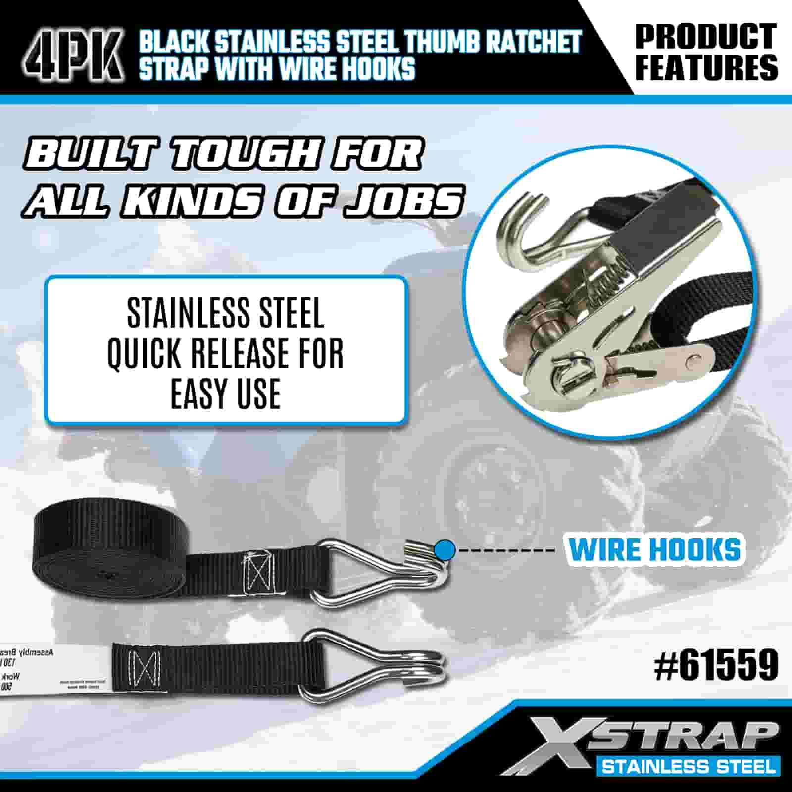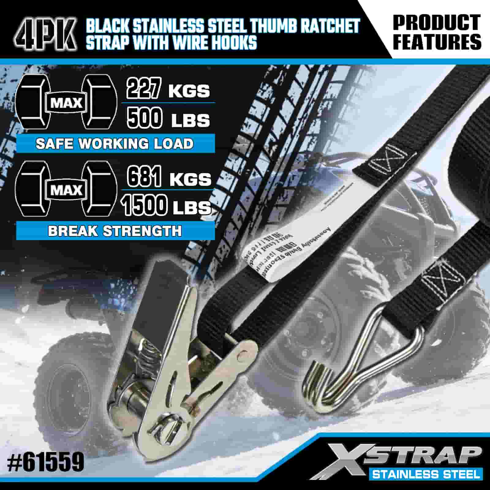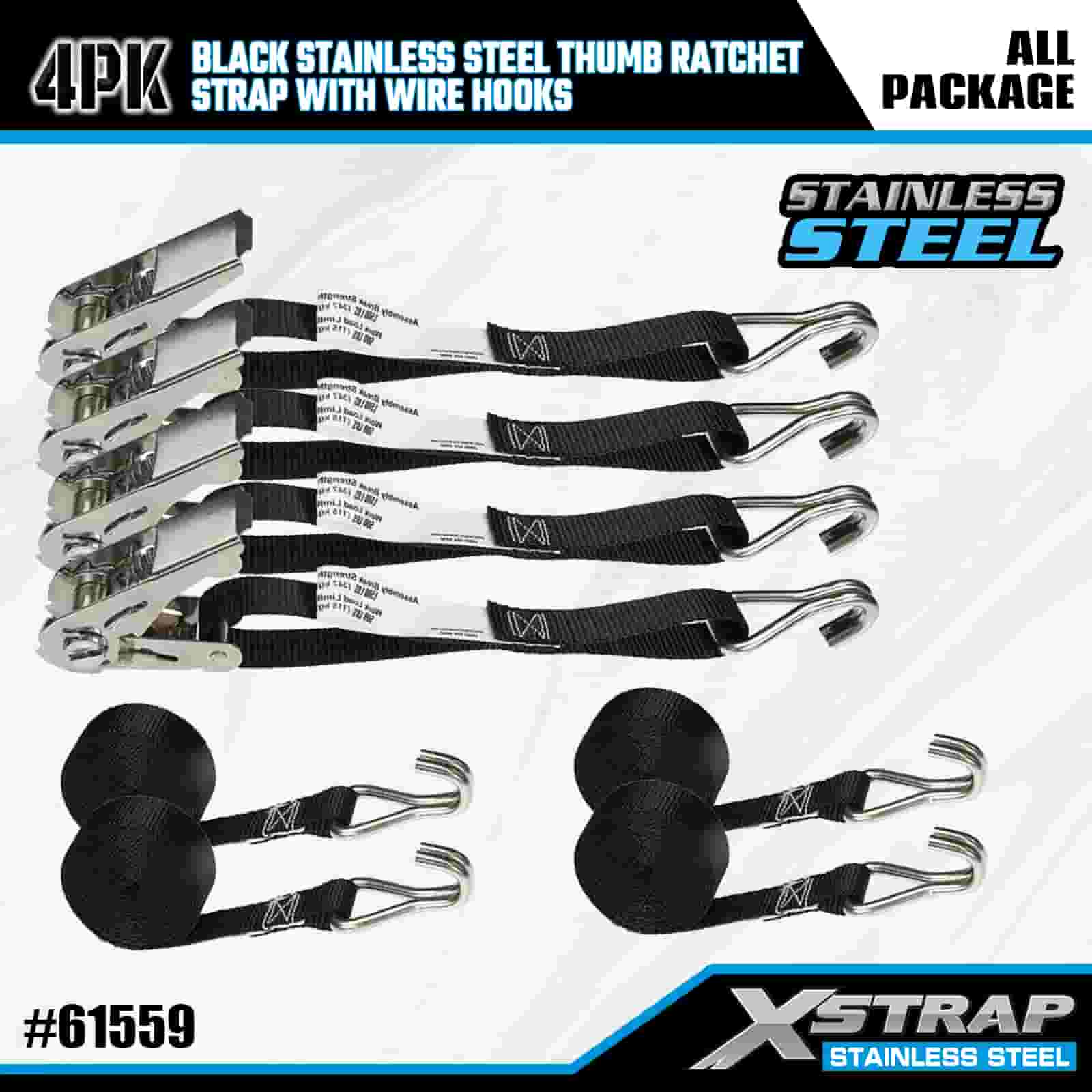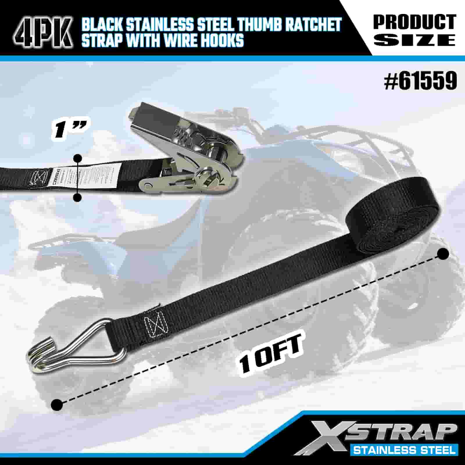 Xstrap 4PK Trinquete de pulgar de acero inoxidable negro con ganchos de alambre, correa de amarre de poliéster de 1" x 10', correa de trinquete, capacidad de 500 libras, correas de seguridad de amarre de carga con ganchos de alambre para remolque, remolque de plataforma plana, bote de esquí, automóvil pequeño, equipo pesado.