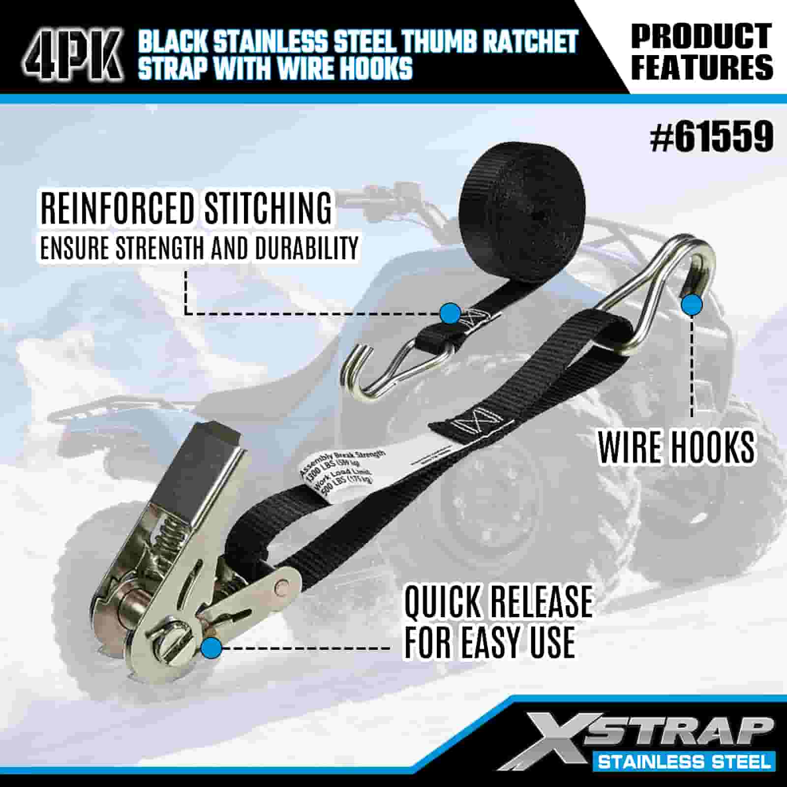 - Resistente a la aventura y a la industria, diseñada para funcionarDiseñada tanto para el transporte de motocicletas todoterreno como para uso pesado en lugares de trabajo, esta correa de trinquete de acero inoxidable está diseñada para hacer frente al barro, la nieve y el desgaste diario. Confíe en los 20 años de experiencia en control de carga de XStrap para obtener una bodega en la que pueda confiar, sin importar el terreno.