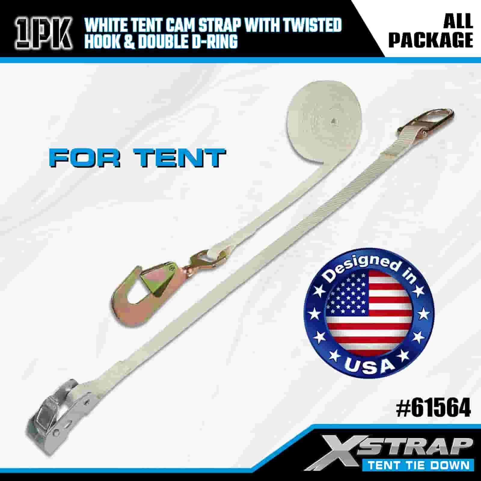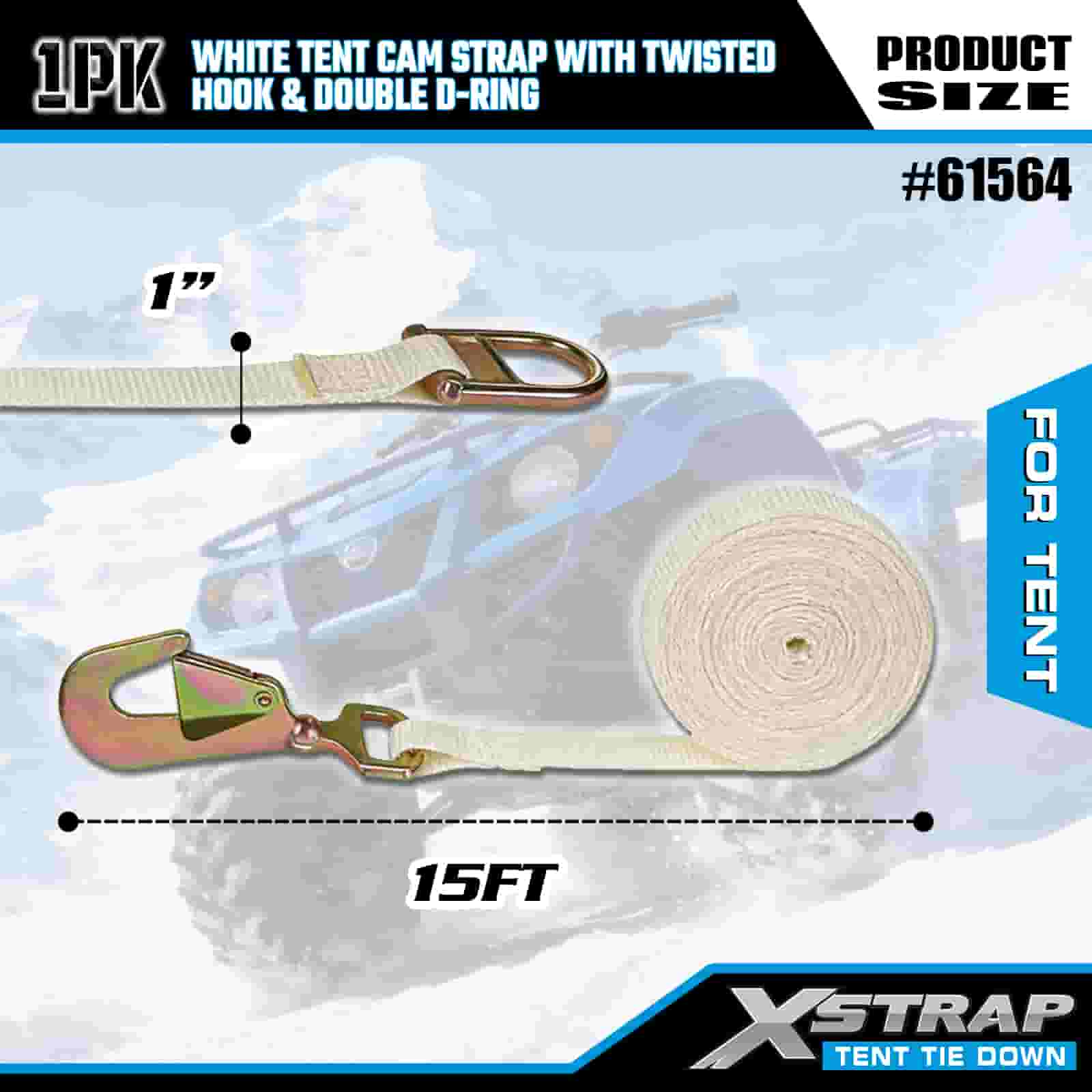 Xstrap Correa blanca para leva de tienda de campaña con gancho trenzado y anillo doble en D, correa de amarre de poliéster de 1" x 15', correa de trinquete, capacidad de 440 libras, correas de seguridad de amarre de carga con Gancho retorcido y anillo doble D para Control de Carga, Fijación de Carpa.