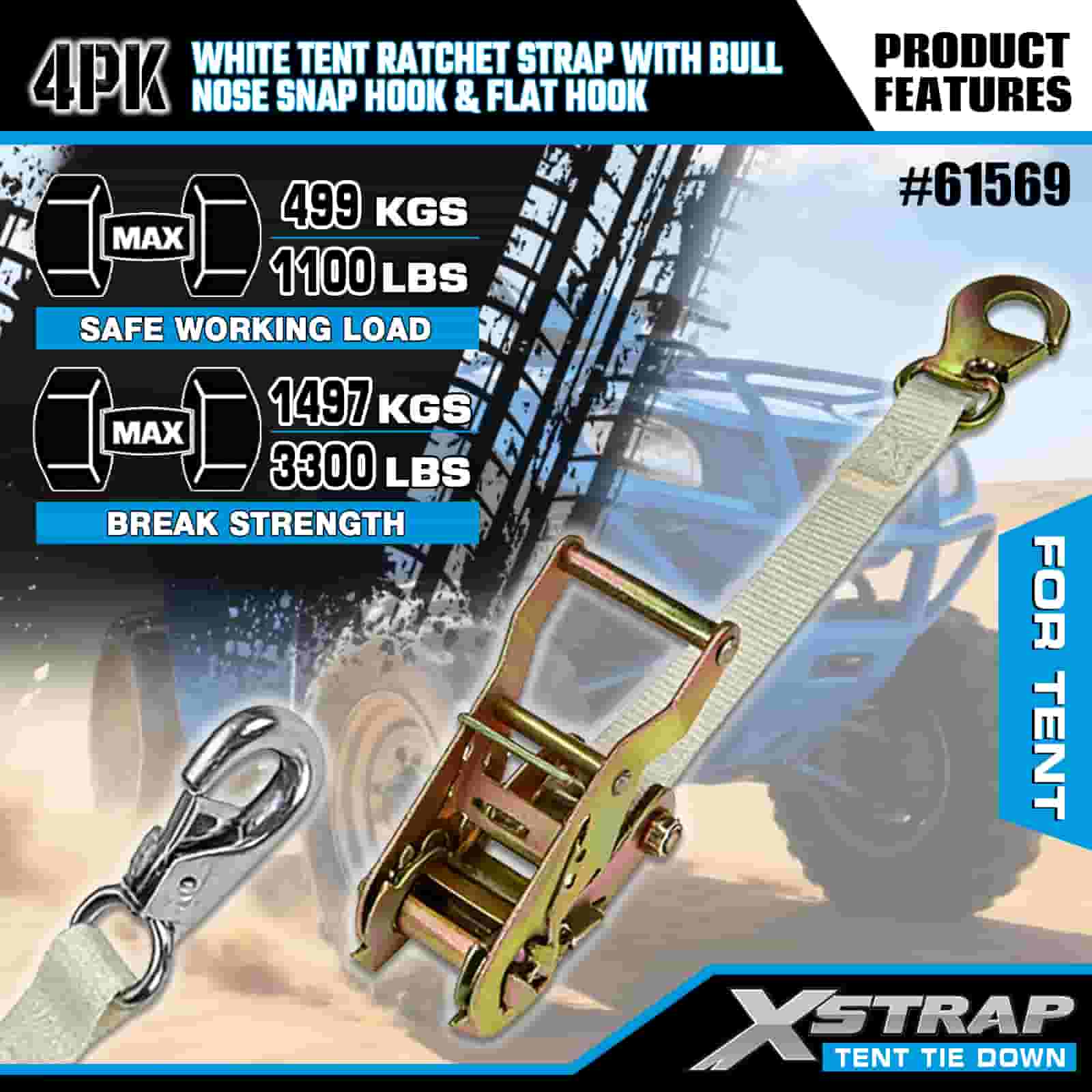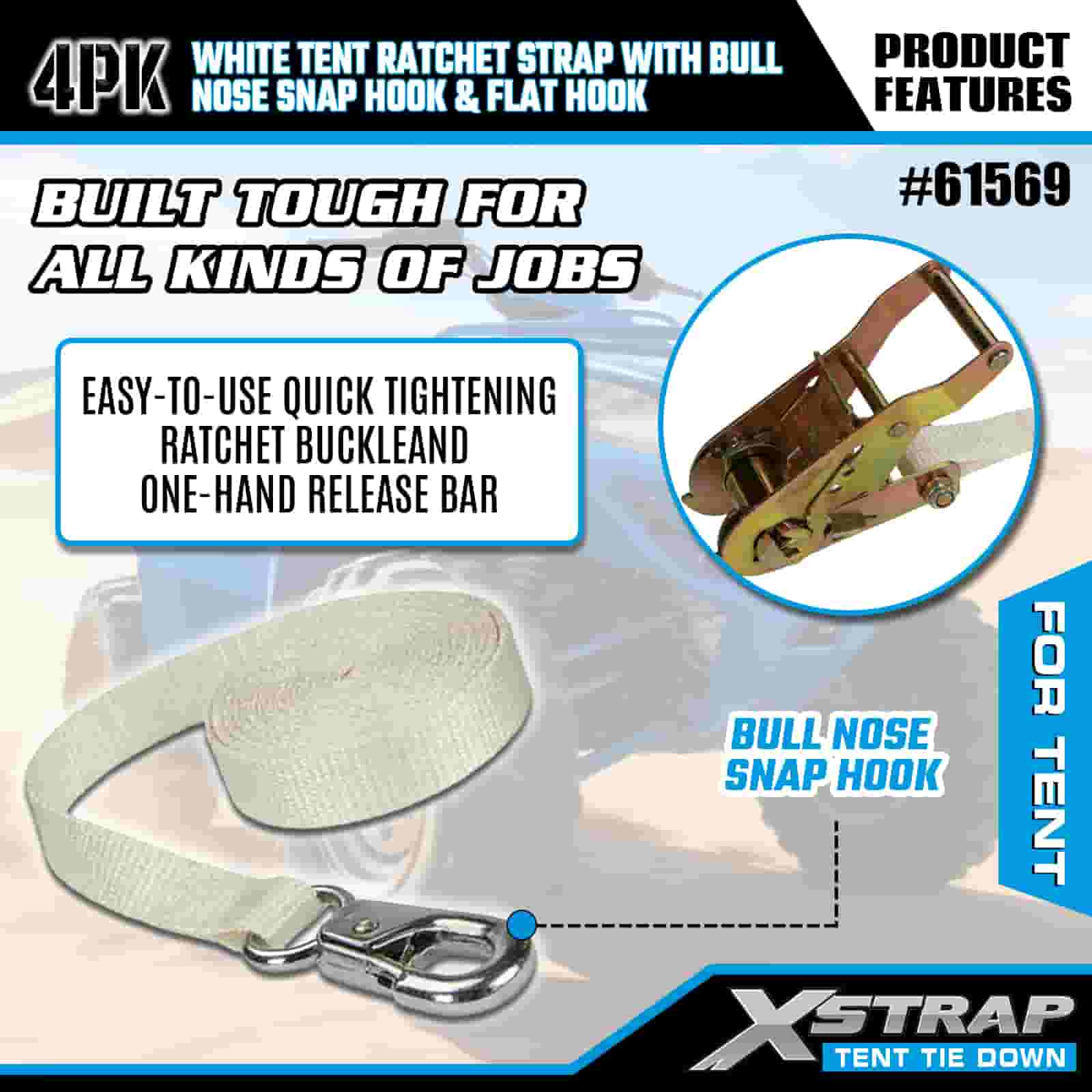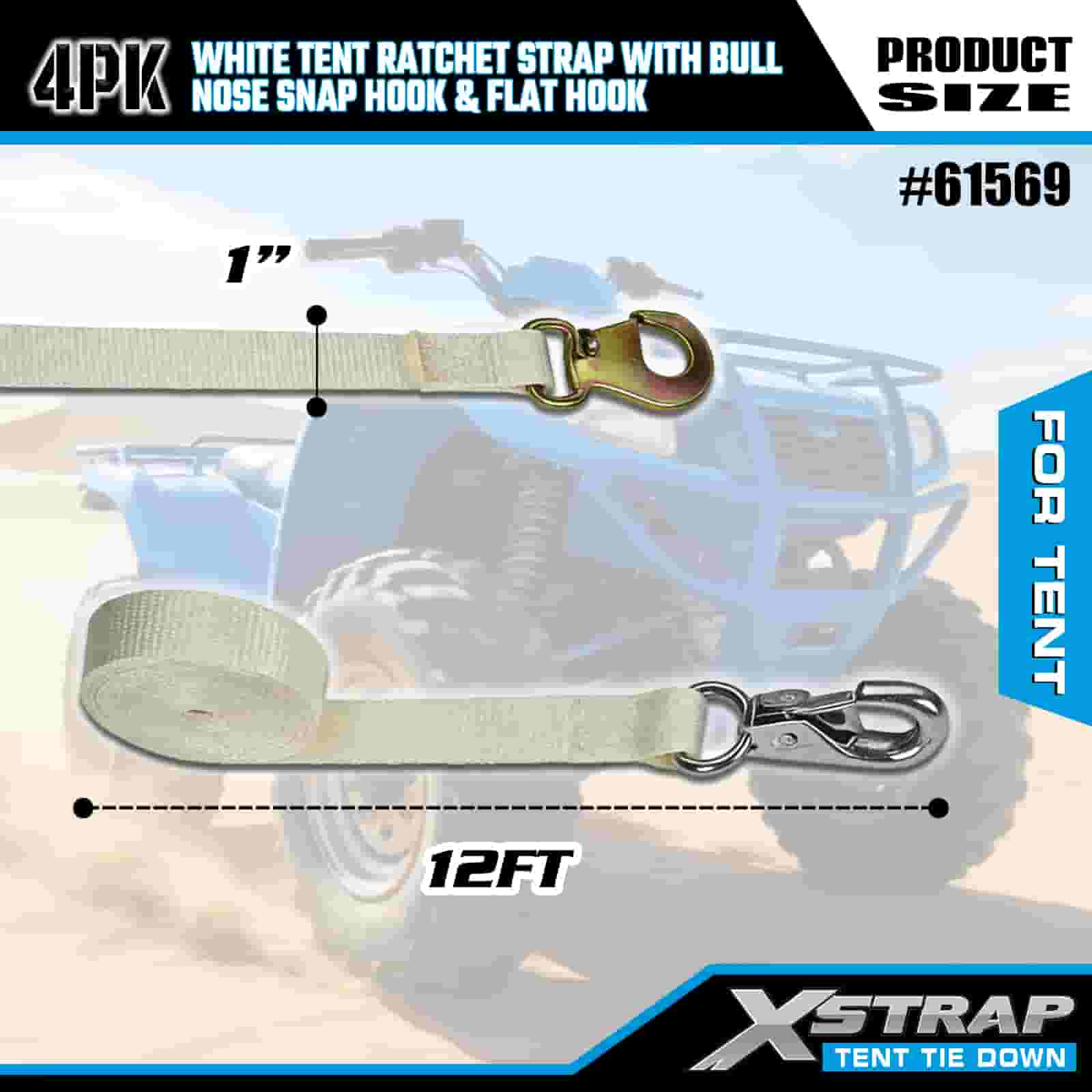 Xstrap 4PK Correa de trinquete blanca para tienda de campaña con gancho de seguridad de punta redonda y gancho plano, correa de amarre de poliéster de 1" x 12', correa de trinquete, capacidad de 1100 libras, correas de seguridad de amarre de carga con gancho de presión de nariz y gancho plano para control de carga, fijación de tienda de campaña.