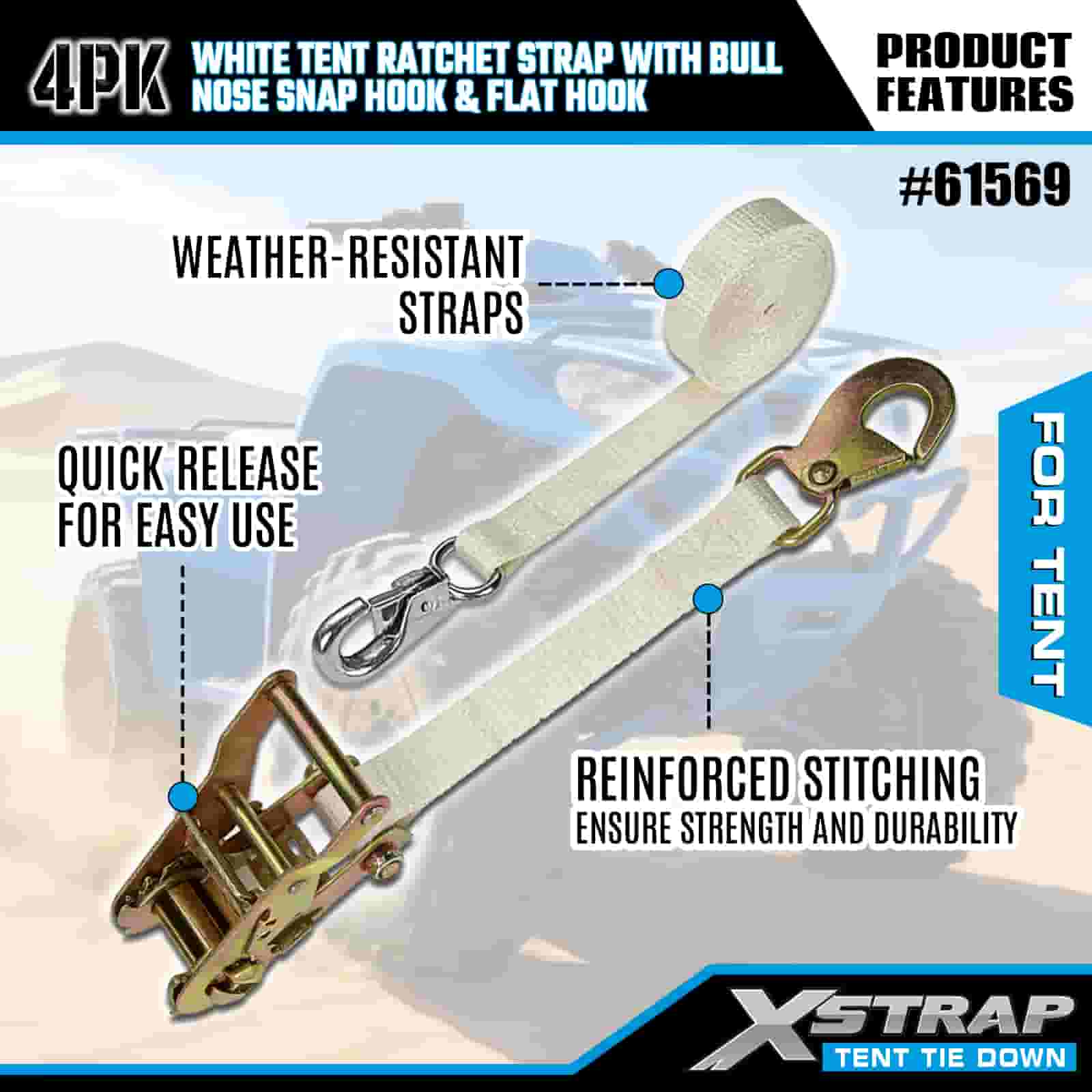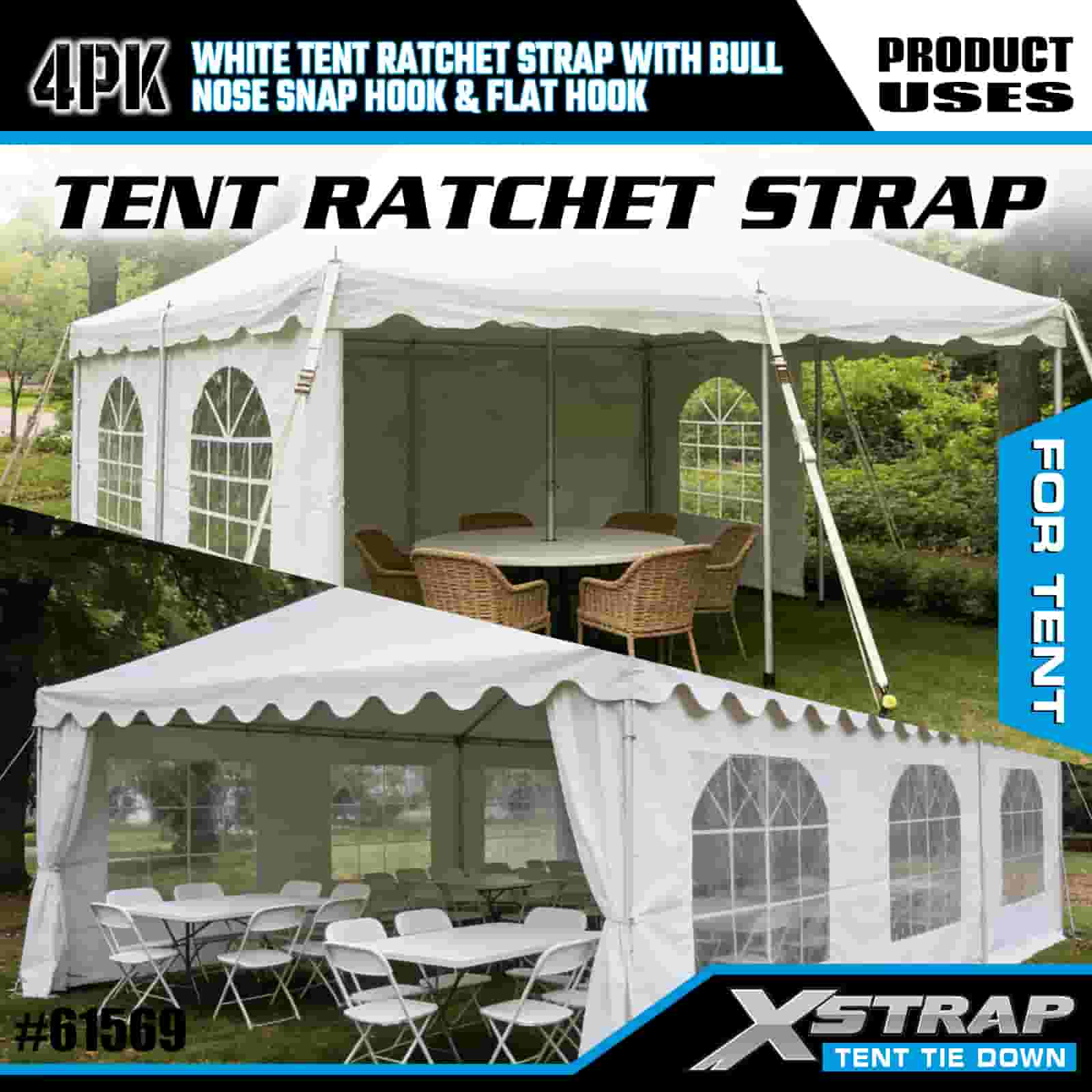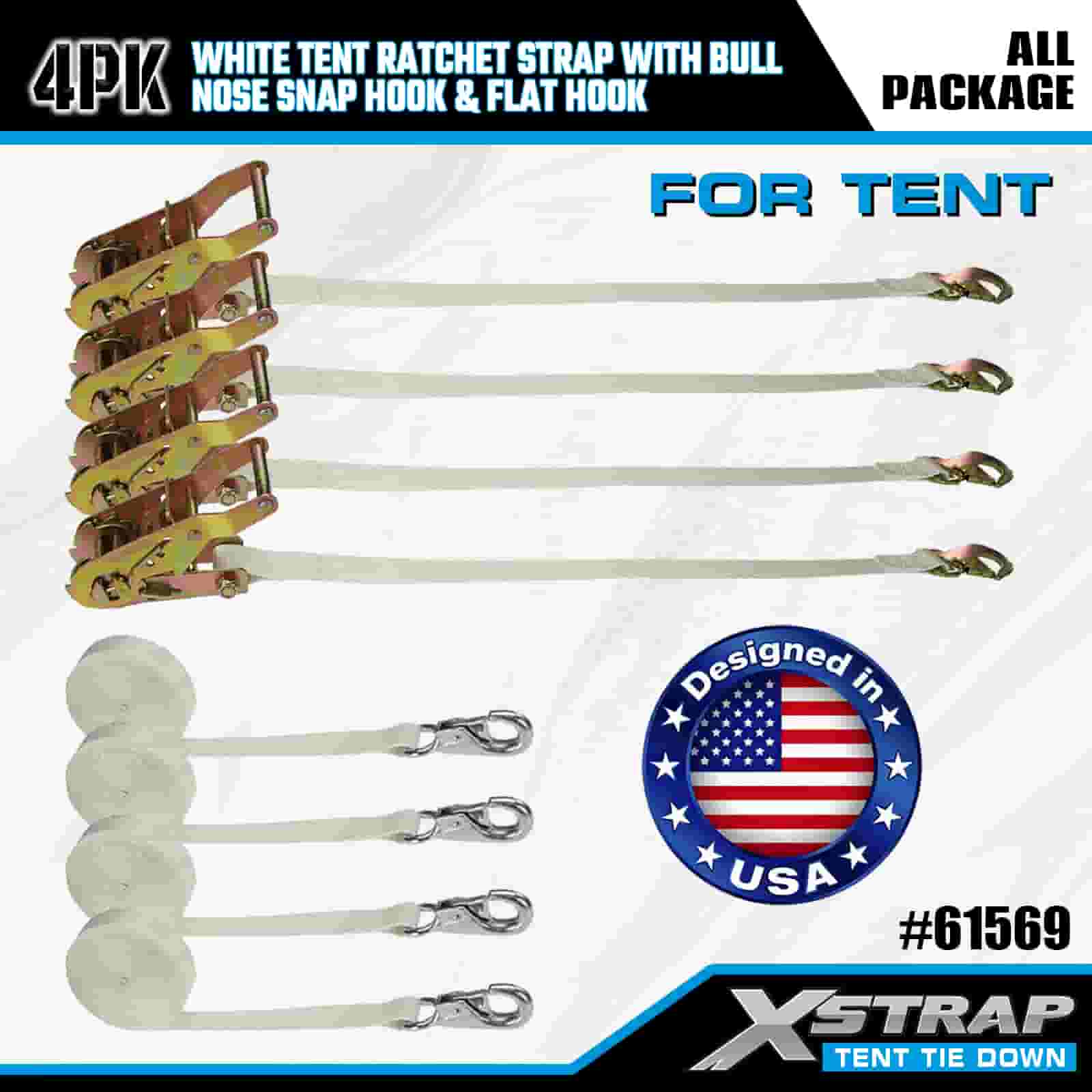 Xstrap 4PK Correa de trinquete blanca para tienda de campaña con gancho de seguridad de punta redonda y gancho plano, correa de amarre de poliéster de 1" x 12', correa de trinquete, capacidad de 1100 libras, correas de seguridad de amarre de carga con gancho de presión de nariz y gancho plano para control de carga, fijación de tienda de campaña.