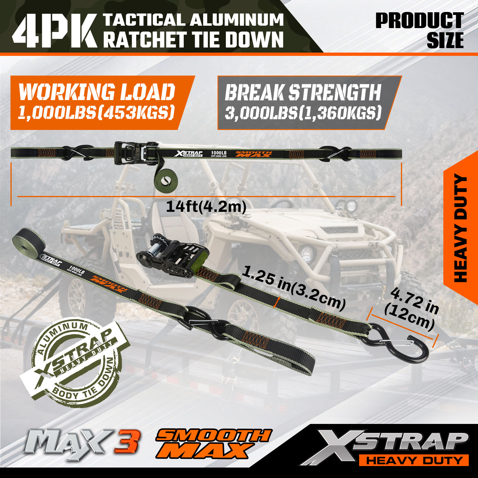 El amarre con trinquete táctico Xstrap mide 1,25 pulgadas x 12 pies, la carga de trabajo segura es de 1000 libras y la resistencia a la rotura es de 3000 libras.