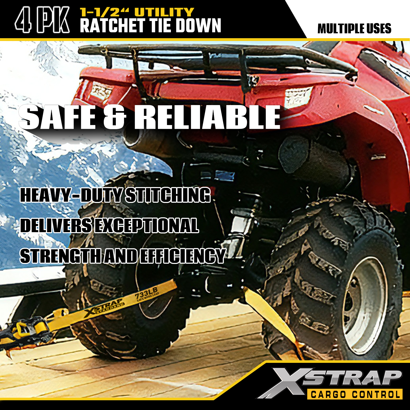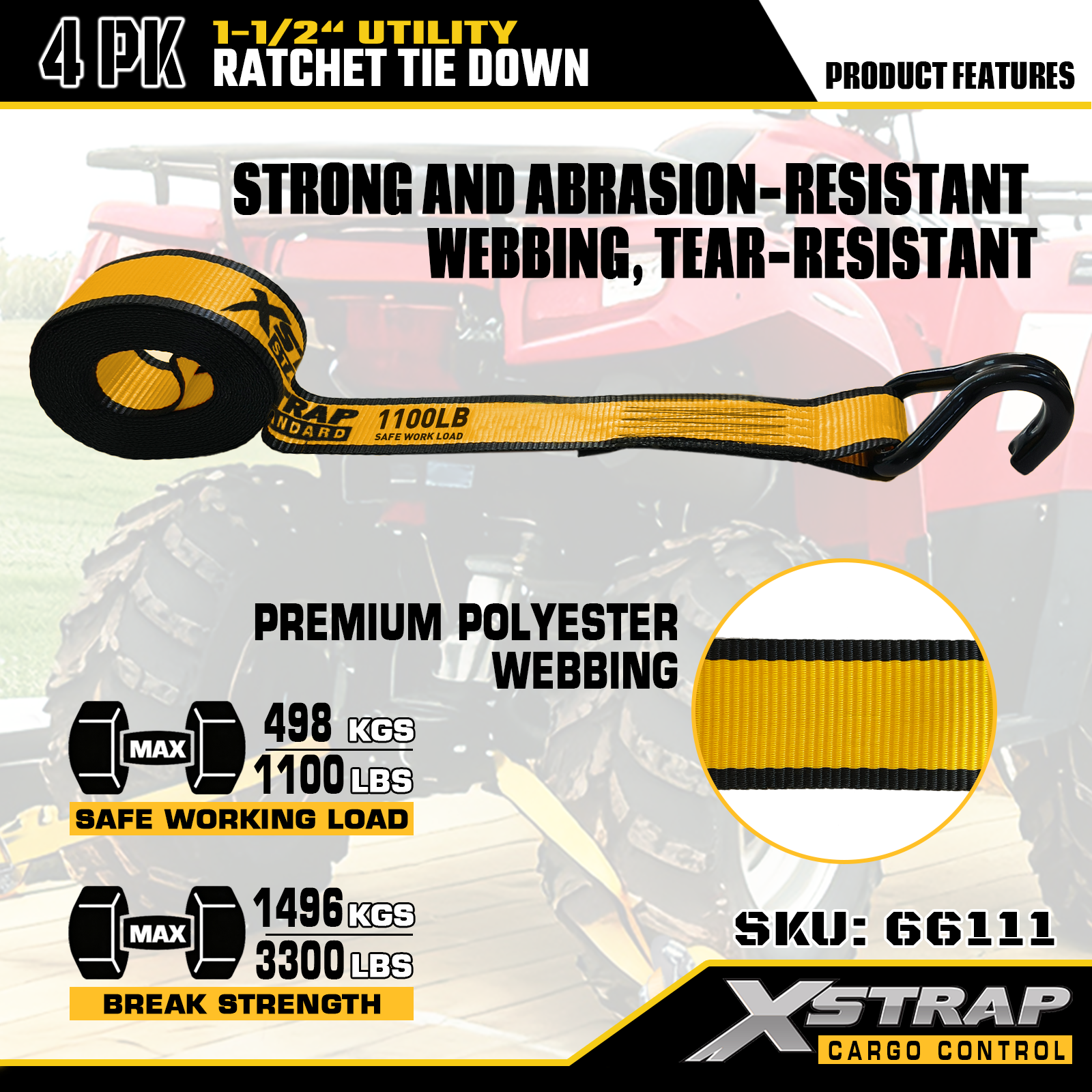 El amarre con trinquete con mango en T Xstrap mide 1,5 pulgadas x 16 pies, la carga de trabajo segura es de 1100 libras y la resistencia a la rotura es de 3300 libras.