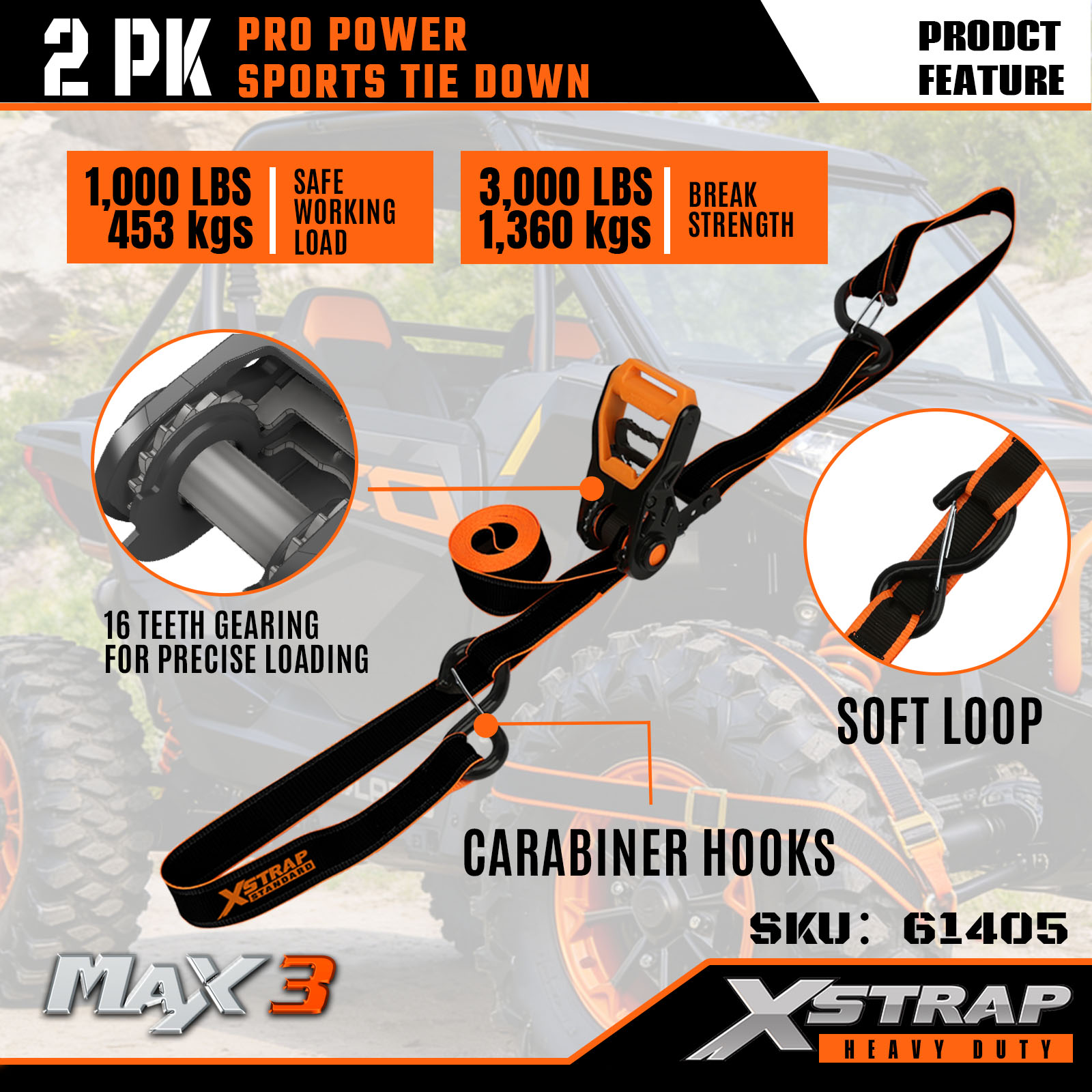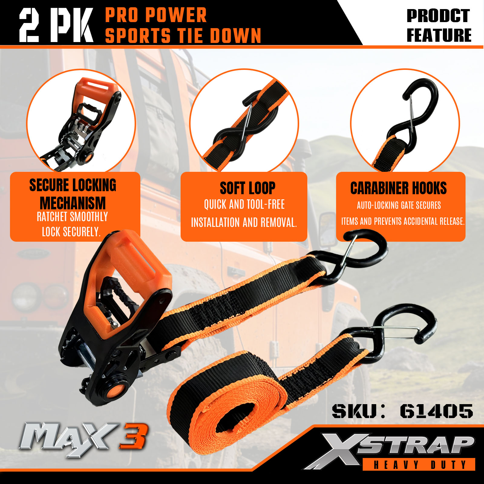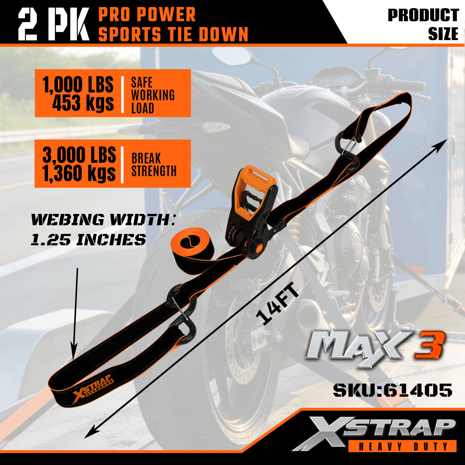 Xstrap Paquete de 2 correas de amarre PRO Power Sports, correa de amarre de poliéster de 1-1/4" x 14', correa de trinquete para tirar, correas de seguridad de amarre de carga de 1000 libras de capacidad con ganchos de mosquetón para camiones, SUV, bastidores superiores de automóviles y motocicletas.