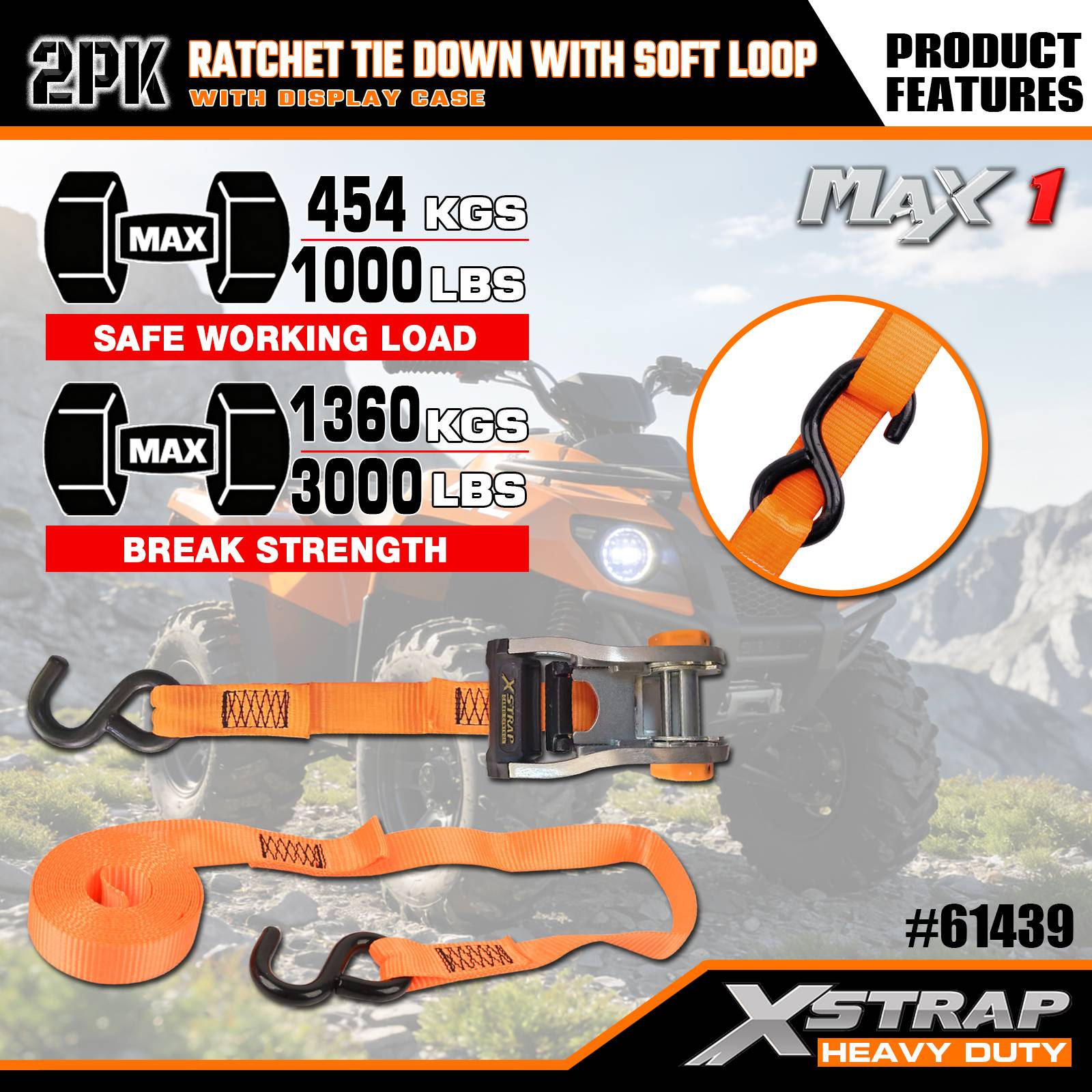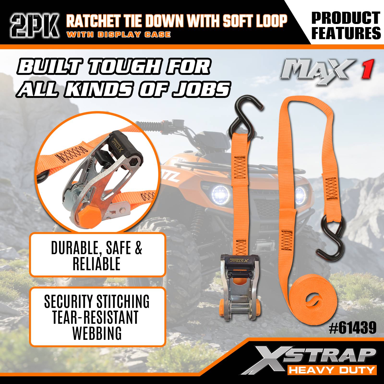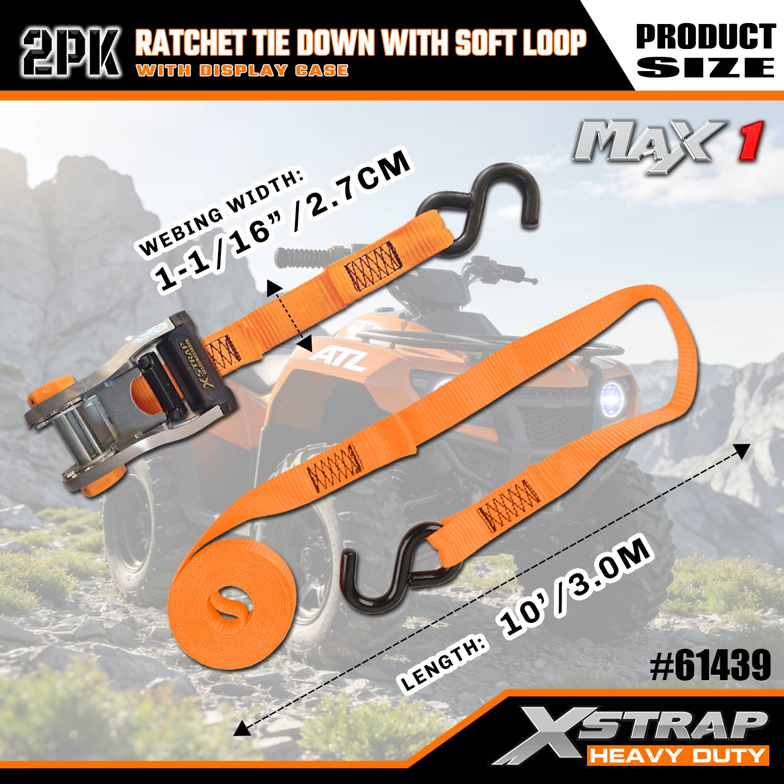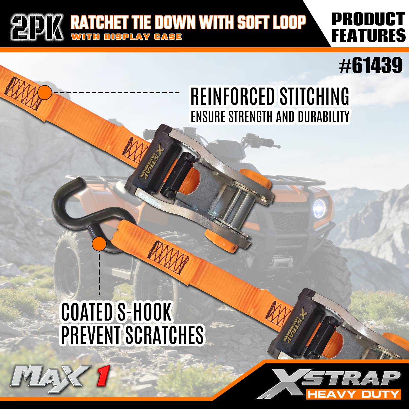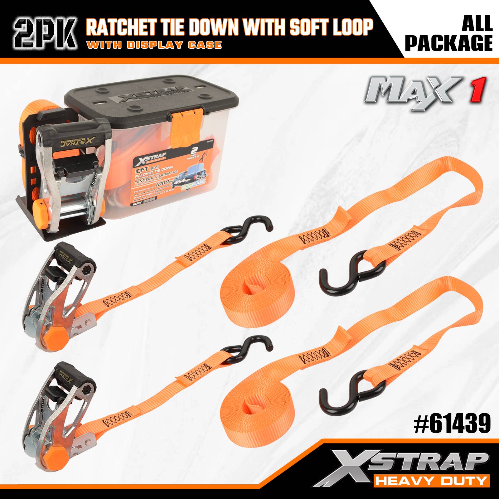 Xstrap 2 unidades de amarre con trinquete con bucle suave, correa de amarre de poliéster de 1-1/16" x 10', correa de trinquete con capacidad de 1000 libras, correas de seguridad de amarre de carga con ganchos en S para camiones, SUV, bastidores superiores de automóviles y motocicletas.