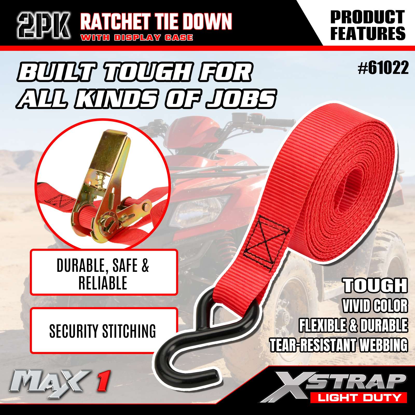 Las correas de amarre con trinquete son herramientas de seguridad livianas diseñadas para una amplia gama de aplicaciones de transporte y almacenamiento. Están diseñados para sujetar de forma segura y confiable cargas como motocicletas, vehículos todo terreno, embarcaciones pequeñas, muebles, materiales de construcción y otros artículos grandes en camionetas, remolques, plataformas y portaequipajes. Construido con la durabilidad como principio fundamental, este juego de 2 paquetes es adecuado tanto para uso personal como comercial y ofrece una solución confiable para las necesidades diarias de transporte, mudanza, paisajismo y transporte recreativo. El empaque de exhibición incluido garantiza que el producto esté listo para la venta y presentado visualmente para resaltar sus características clave.