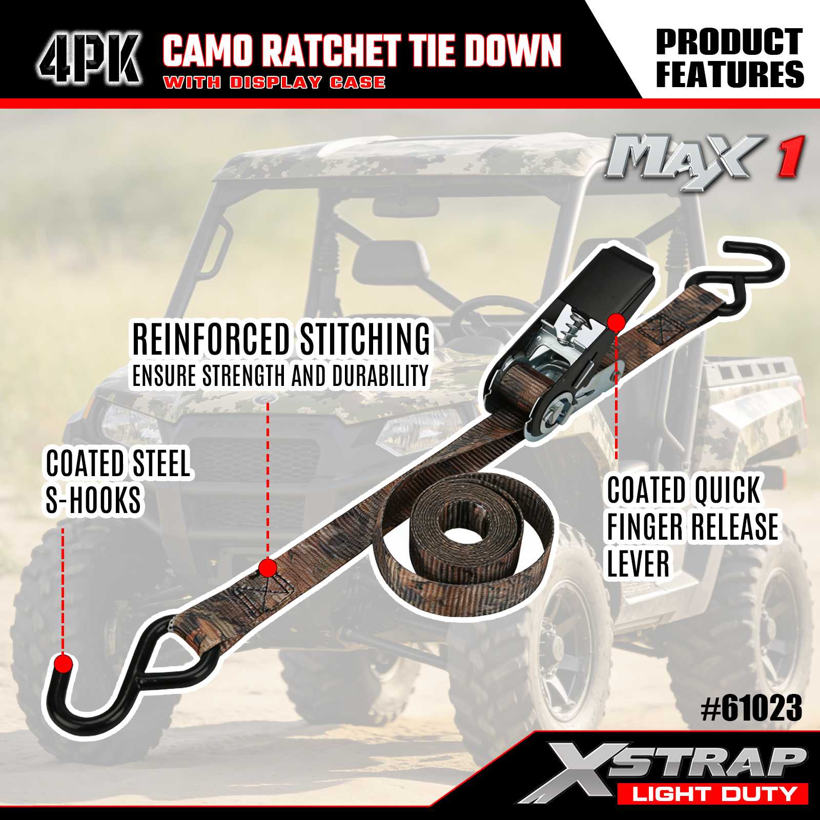 Las correas de amarre con trinquete Xstrap 4PK CAMO miden 1 pulgada x 10 pies, la carga de trabajo segura es de 300 libras y la resistencia a la rotura es de 900 libras.