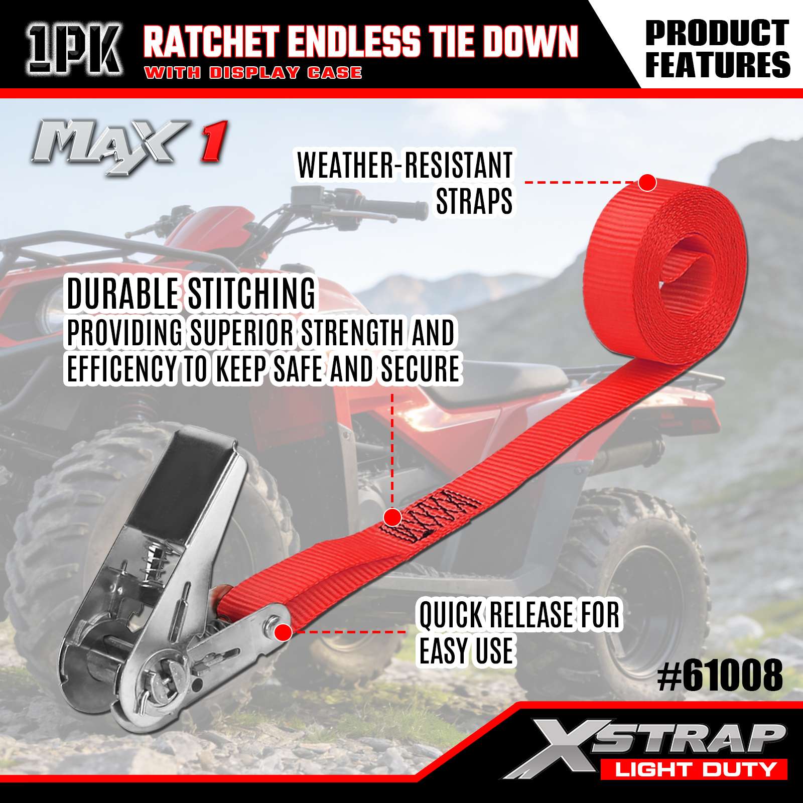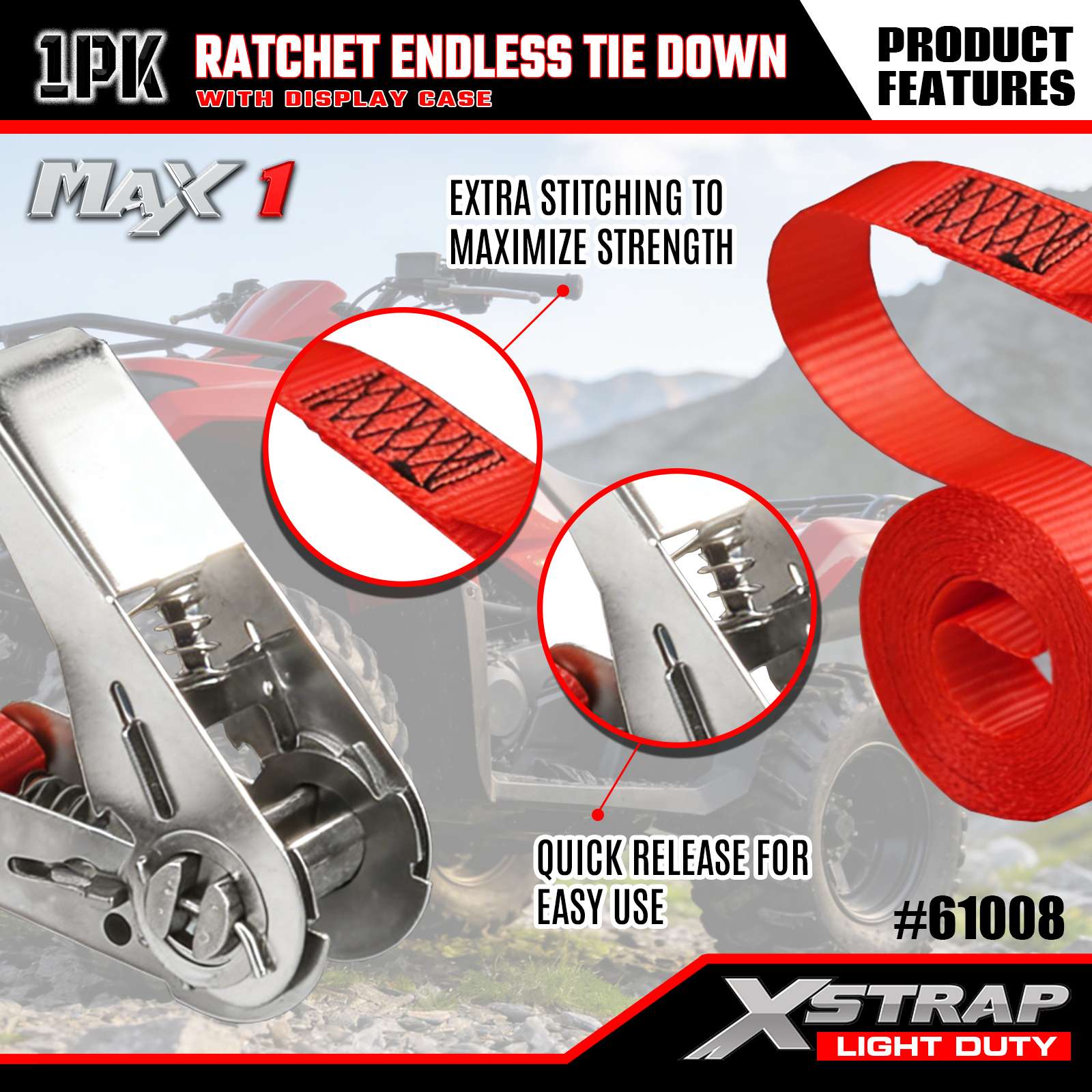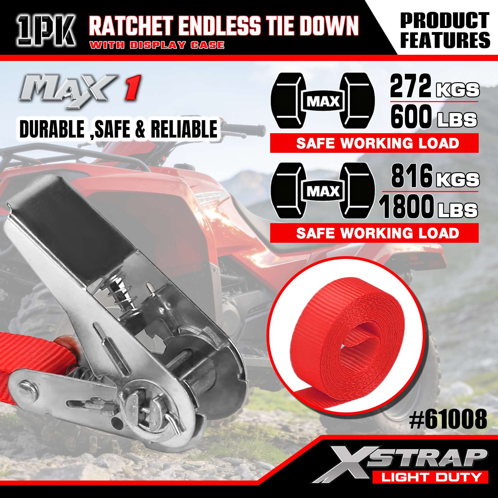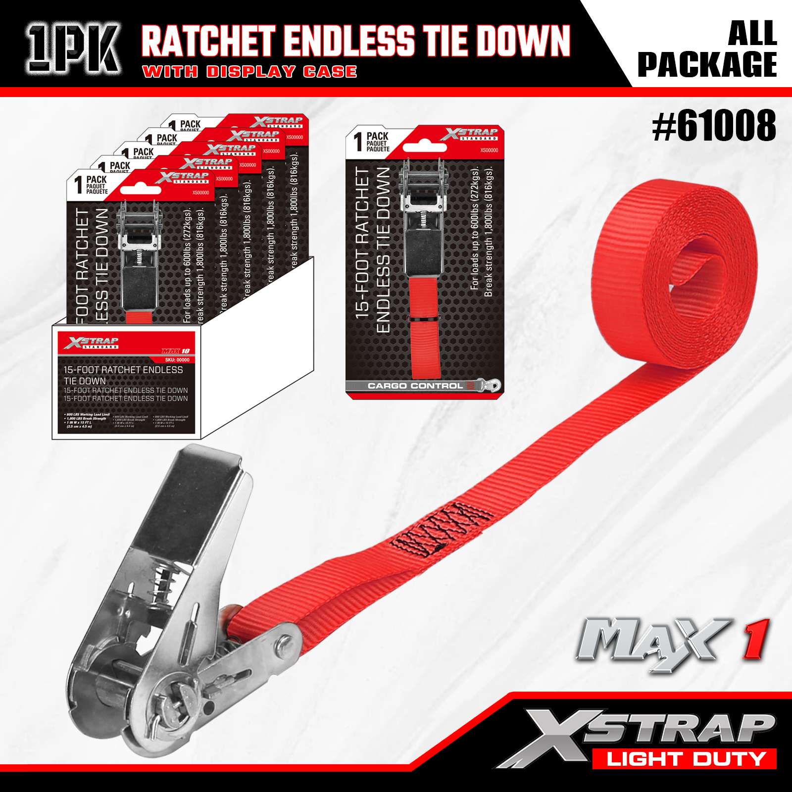 Xstrap 1 paquete de correas de amarre sin fin con trinquete, 1 x 15 pies, tapa de carga de 600 libras, resistencia a la rotura de 1800 libras, correas de carga para electrodomésticos móviles, equipos de césped, motocicletas, camuflaje