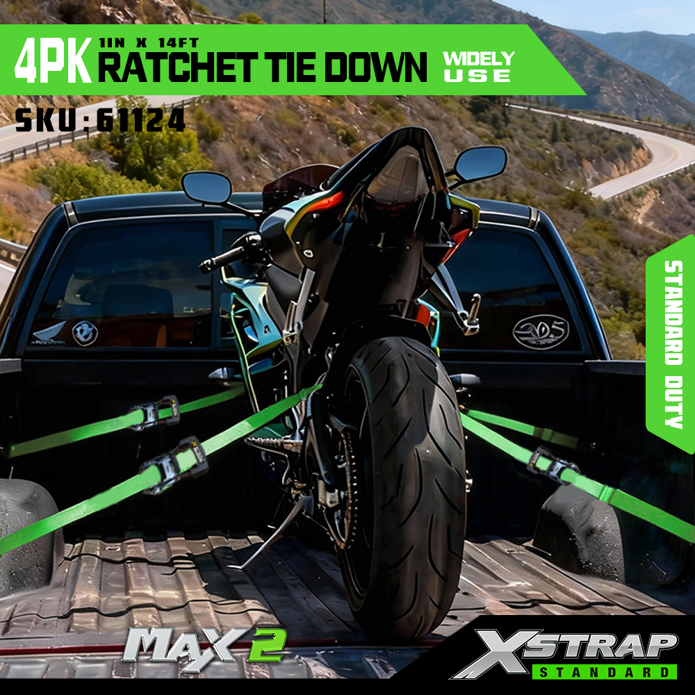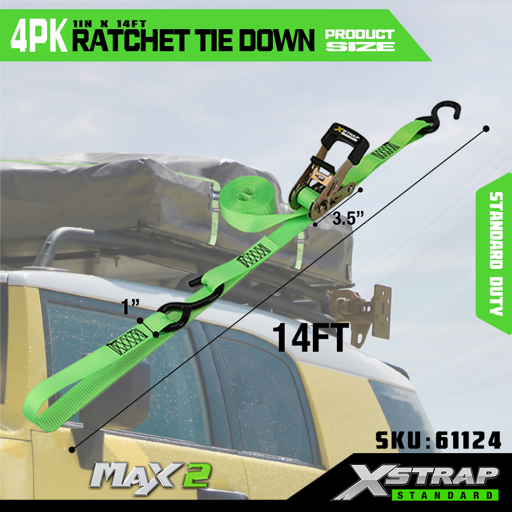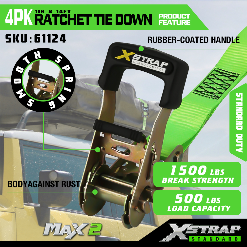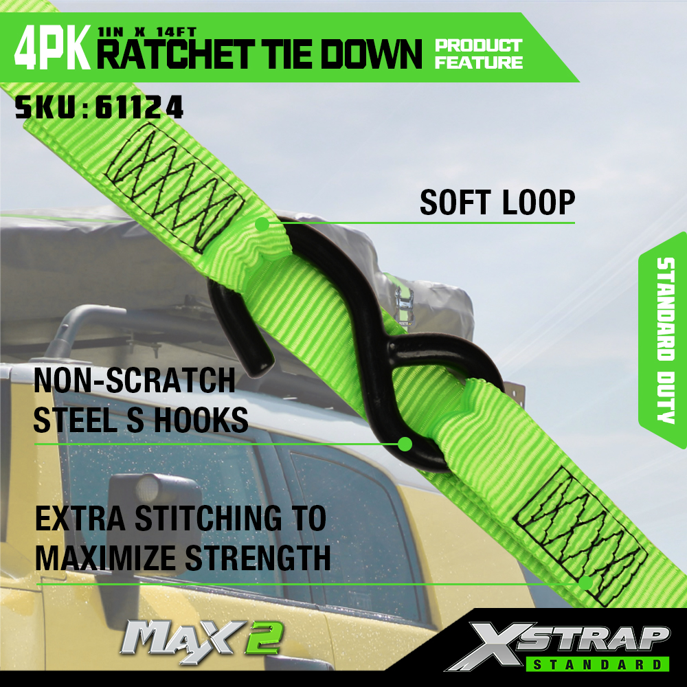 Xstrap Paquete de 4 correas de trinquete de amarre, correa de amarre de trinquete de poliéster de 1"x 14' con bucle suave, correas de seguridad de amarre de carga de 1500 libras (500 libras) de capacidad con trinquete de metal y ganchos en S para carga, camión, cortacésped, vehículos todo terreno
