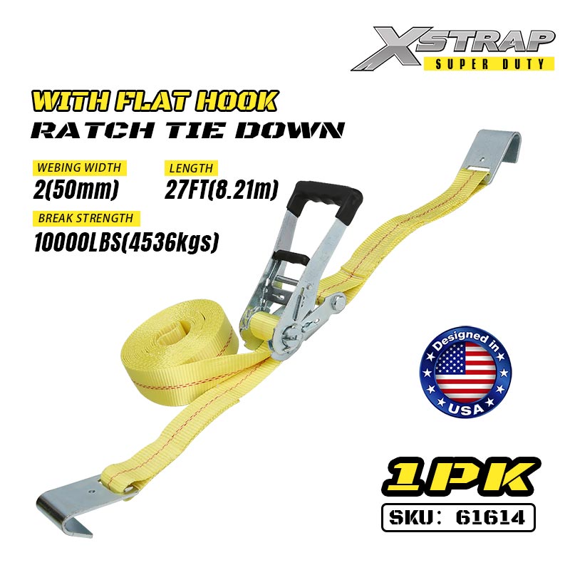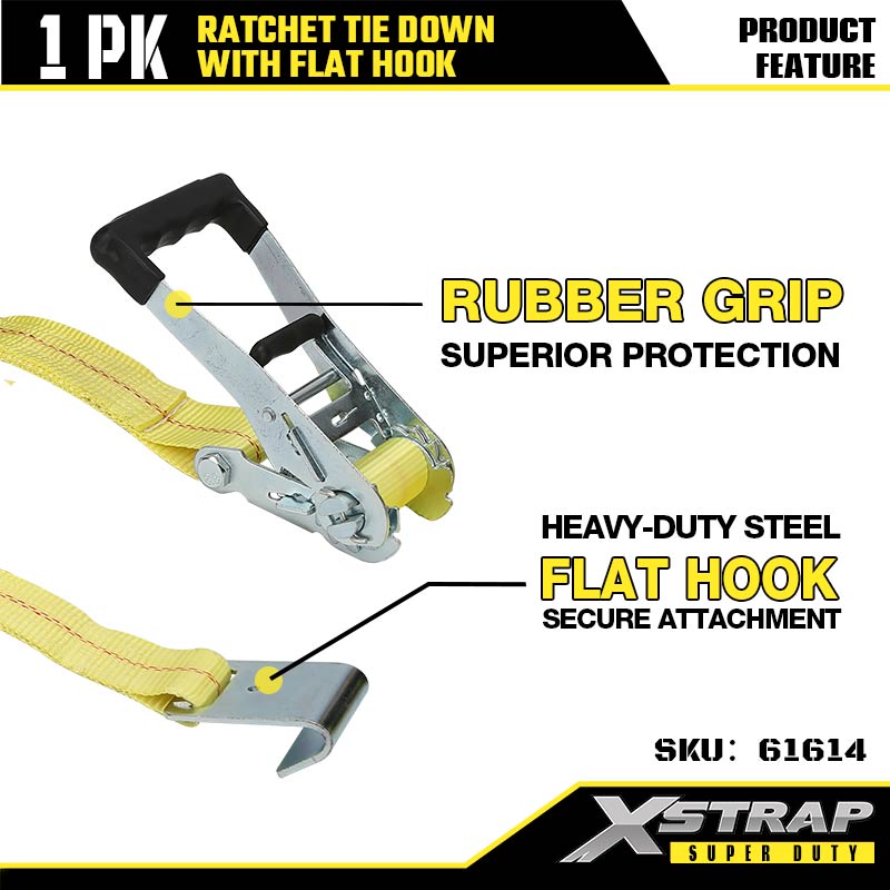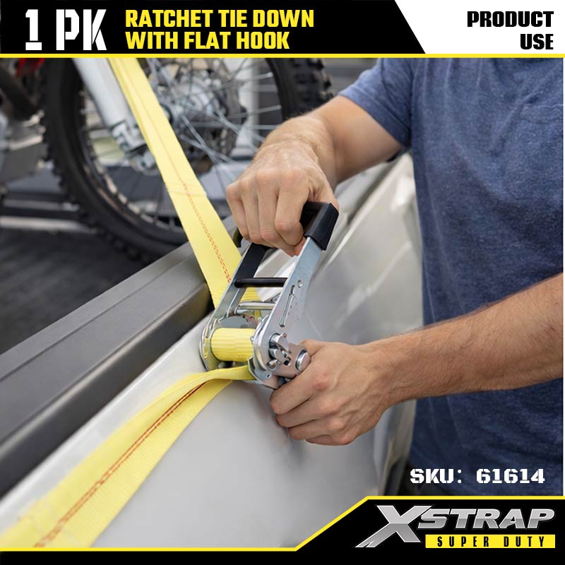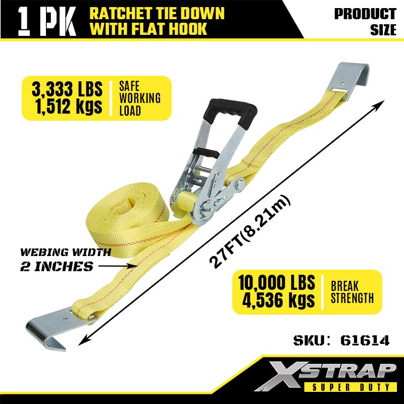 Xstrap Ratcet Tie Down con ganchos planos, correa de amarre de poliéster de 2" x 27', correa de trinquete, capacidad de 3333 lb, correas de seguridad de amarre de carga con ganchos planos para remolque de servicio pesado, remolque de plataforma plana, bote de esquí, automóvil pequeño, equipo pesado.