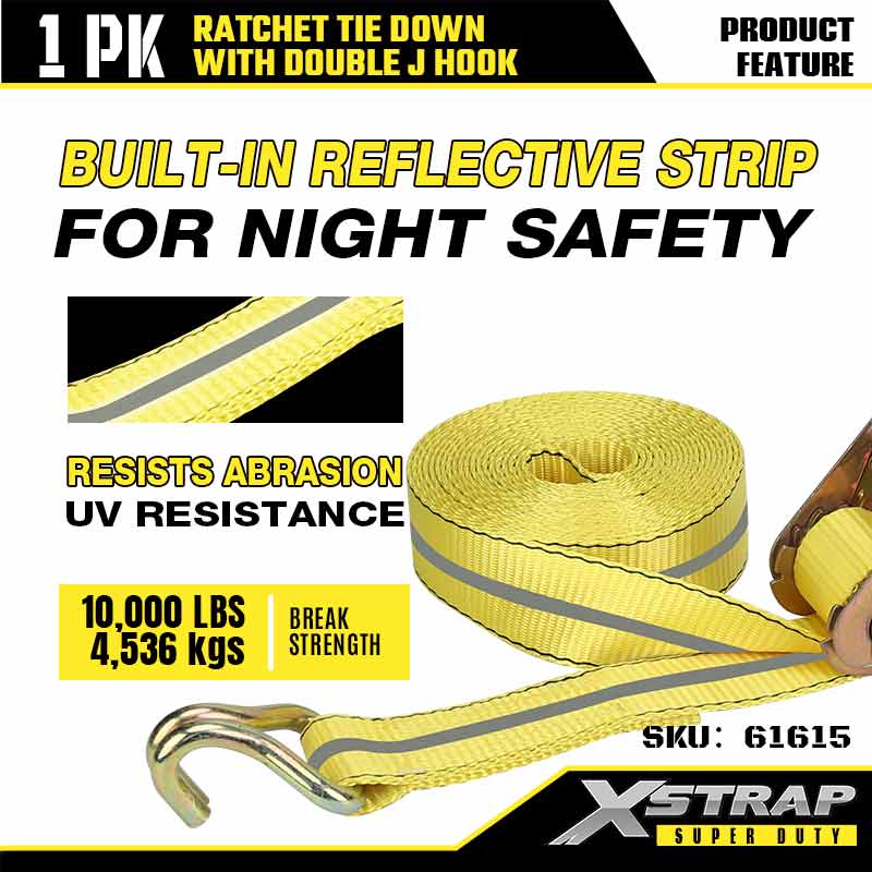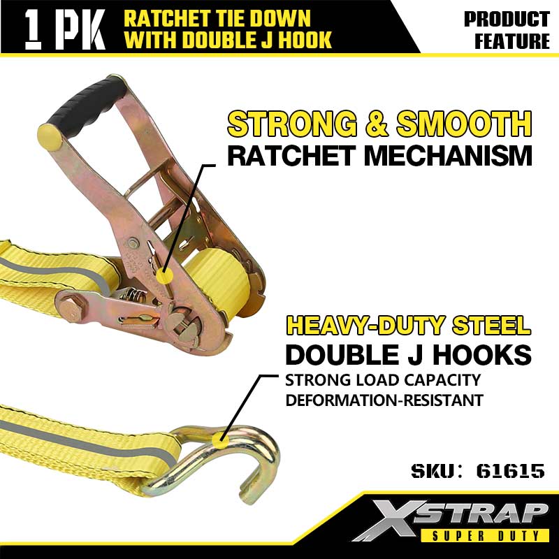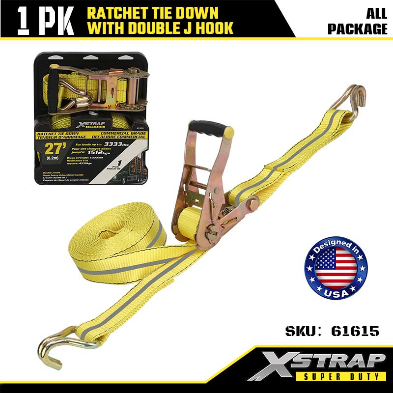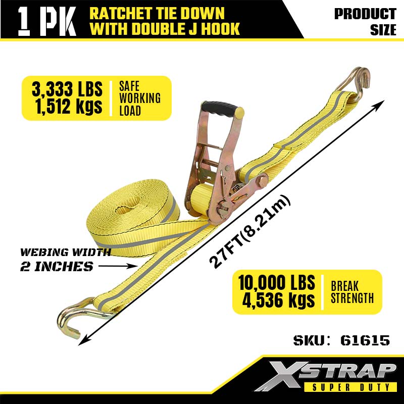 Xstrap Ratcet Tie Down con ganchos dobles en J, correa de amarre de poliéster de 2" x 27', correa de trinquete, capacidad de 3333 lb, correas de seguridad de amarre de carga con ganchos dobles en J para remolques de servicio pesado, remolques de plataforma plana, botes de esquí, automóviles pequeños y equipos pesados.