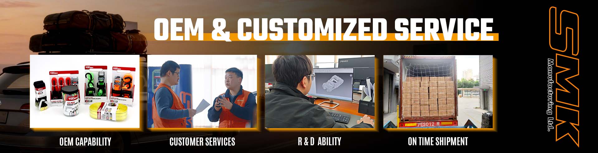 Además de nuestras líneas de productos centrales (correas de ratchet, atesos, cables y dispositivos de remolque), SMK admite a los clientes en el desarrollo de nuevos productos adaptados a las necesidades específicas del mercado. Desde el diseño de la apariencia y la validación estructural hasta la producción en masa, ofrecemos soporte técnico de procesamiento completo.